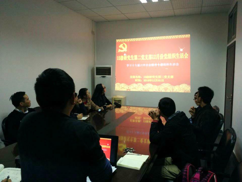 为了深刻了解和学习党的十八届六中全会精神,我们15级研究生第一党支部于2016126日早上在工三-220进行了一次集体的专题活动的学习与讨论。会上党支部书记分别从一要深刻领会十八届六中全会的重大意义,二要深刻领会全会明确习近平总书记核心地位的重大意义,三要深刻领会习近平总书记在全会上的重要讲话精神,四要深刻领会《准则》和《条例》的重大意义。四个方面进行讲解,让支部党员对“四个深刻领会”有了进一步的了解与体会。
