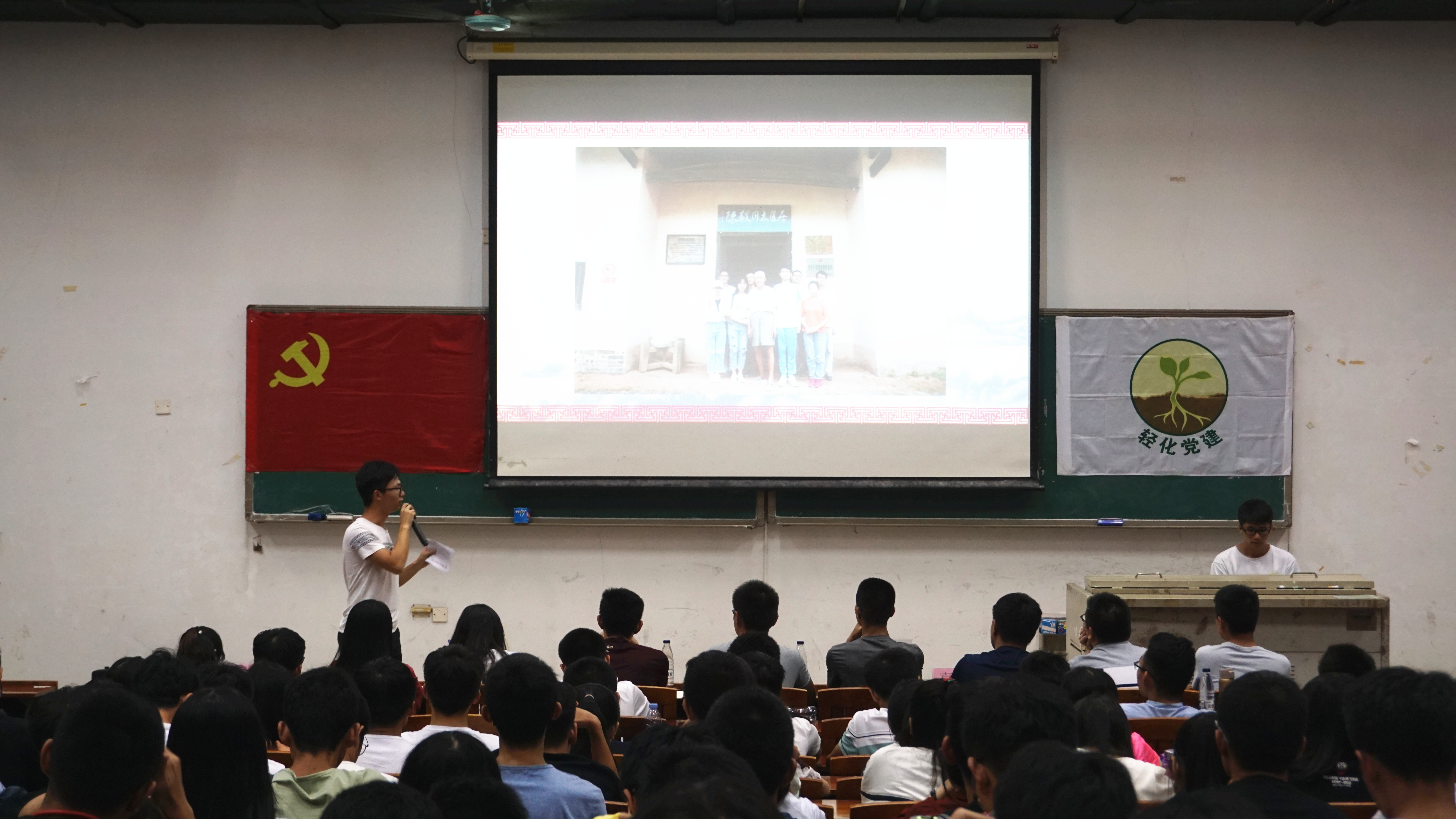 学生党员赖聪首先与大家分享了自己暑期赴赣州及大余两地开展“追寻红色印记,传承红色基因”红色教育活动的经历,生动而充满情感地讲述了一些革命小故事,致敬在战争年代无畏牺牲的革命先烈;接着,对党的基本理论知识和党的光辉历史进行了解读,从过去、现在、未来三个时间维度去比拟党的成长与我们自身的发展,希望同学们能不忘过去、立足当下、奋进未来!
