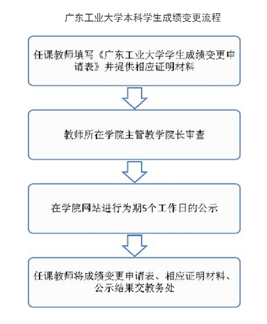 学生成绩变更申请表》并提供相应证明材料,经教师所在学院主管教学院长审查后,成绩更改申请需在学院网站进行为期5个工作日的公示,公示期满无异议后,任课教师将成绩变更申请表、相应证明材料、公示结果交教务处,由教务处在教务管理系统中进行处理。