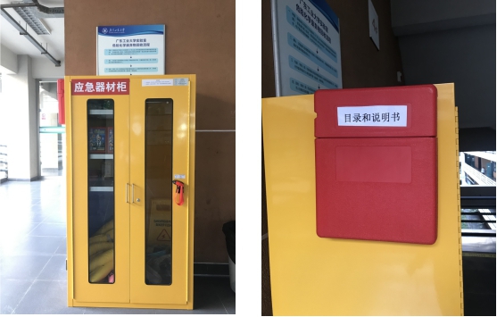 为加强学院消防应急处理能力,保障师生安全,特购买8台消防应急柜,置于每层楼的中部楼梯口,内附应急创伤包、防护面屏、防毒面具、防护服、氯丁橡胶手套、防漏托盘等应急物资。应急柜旁的红色盒子附物资目录和使用说明,使用前请师生务必认真阅读。非紧急情况请联系工学四号馆319蒋老师拿钥匙,如遇到实验室着火、浓烟、大量试剂泄漏等紧急情况请用安全锤凿开使用。