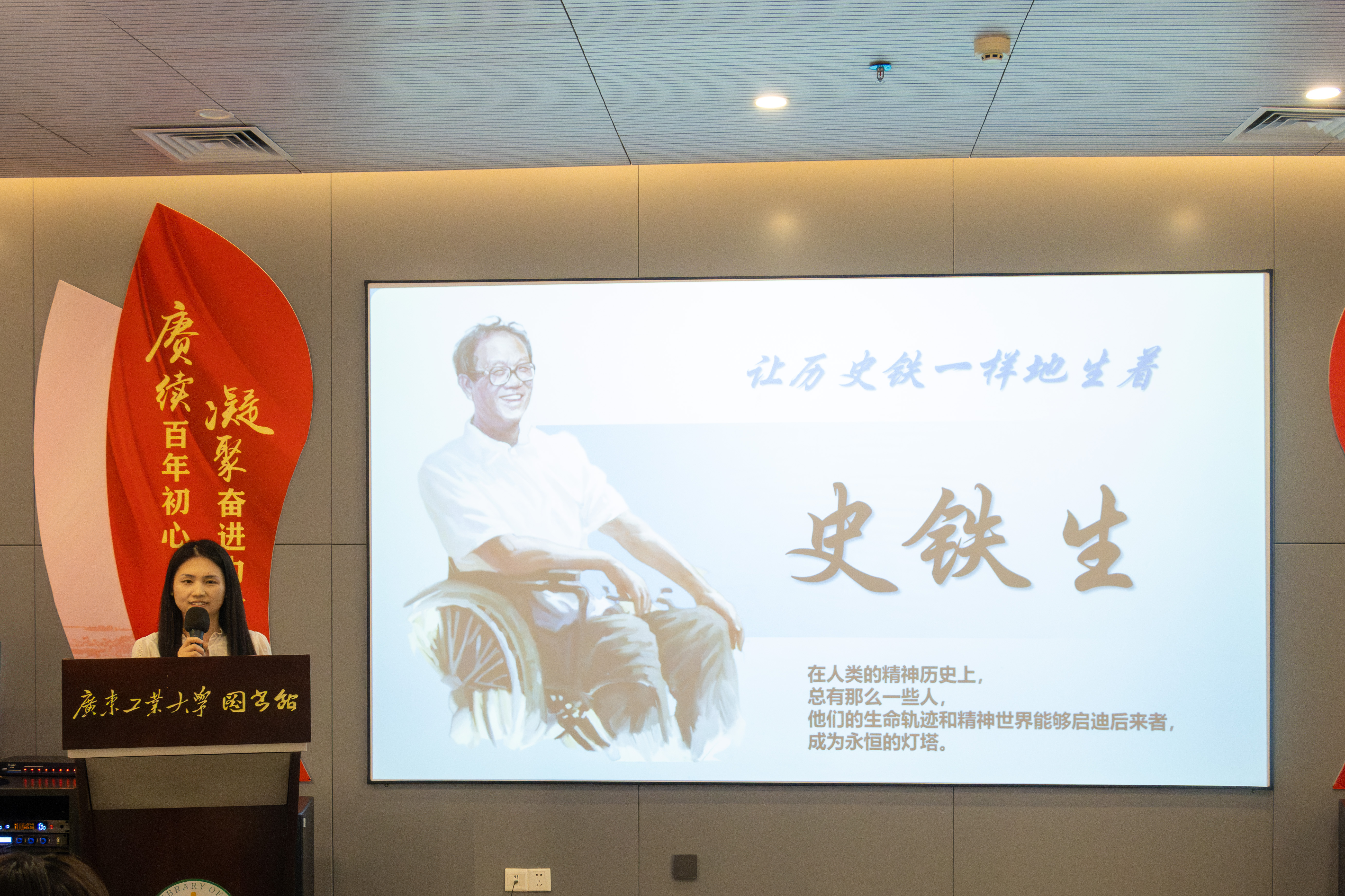 第一位读书报告人陈浩然同学向我们分享了他心中的史铁生,分析《我与地坛》中史铁生先生从悲观到平静、清澈的心路历程,阐述史铁生先生对生命的思考和感悟,指出我们在遇到困境时应当冷静下来思考,以积极的生活态度来面对成长路途的挫折。
