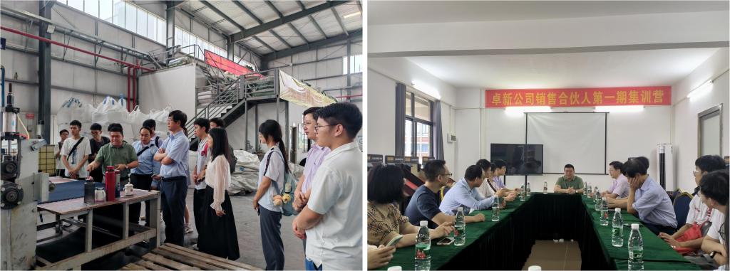 师生来到广东卓新高分子新材料有限公司,在总经理谢俊辉的带领下,走进公司生产车间,观摩了原料到成品的全生产过程,深入了解了公司在新型汽车脚垫研发原材料、生产机械设备、制造工艺等方面的创新。在交流会上,谢俊辉介绍了汽车脚垫行业新动态,分享了公司食品级、绿色环保的生产理念,并与师生们共同探讨了脚垫材料创新、性价比提高方案。