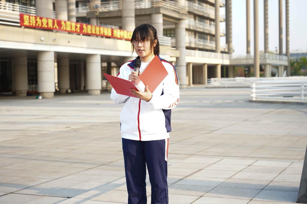 仪式结束后,杨刚老师作国旗下讲话。他首先表示,升旗仪式不仅在于表达对党和国家热爱、祝福,而且在于从祖国辉煌历史中汲取前行力量。随后,杨刚老师提出三点希望与同学们共勉:一是筑牢理想信念根基,怀爱国之情投身强国建设;二是坚守科创报国初心,以自强之志追求开拓创新;三是永葆昂扬奋斗朝气,乘时代发展之势勇攀高峰,与强国建设同频、与广东高质量发展共振,在新时代征程中跑出广工人的青春加速度。