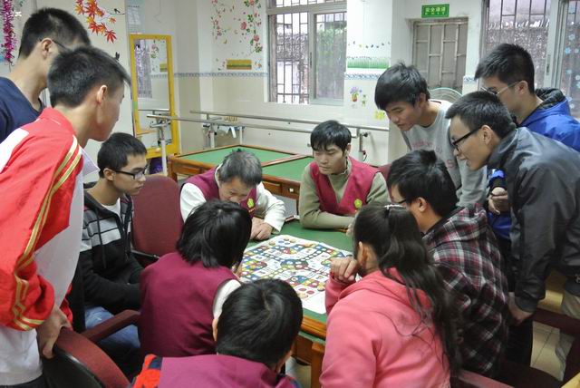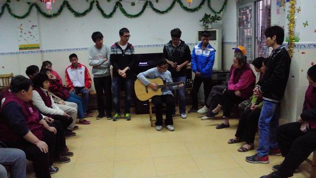 在进行简单的会场布置之后,活动正式开始。工疗人员入座后,主持人发表开场白并安排志愿者和工疗人员配对。随即进行由其中一位志愿者带来的第一个表演——吉他弹唱《外面的世界》。优美轻柔的歌声让人忘记现在已是寒风凛冽的季节,工疗人员和志愿者们都投入到歌曲的意境当中去,一起轻声哼唱。歌曲表演结束后,配对好的志愿者与工疗人员进行互动聊天。聊天过程中歌声不断,此起彼伏。伴随着热烈的气氛,志愿者们随即组织工疗人员进行游戏“快D入嚟个盘度”,工疗人员整齐地排好队,一个接着一个向水盘扔乒乓球。简单又有趣的小游戏将志愿者和工疗人员的距离拉得更近。最后一个节目是由志愿者们带来的手语歌曲表演,表演的过程中工疗人员也一起学习了歌曲《真心英雄》的手语,气氛更加高涨。活动结束后,工疗人员与志愿者们进行了合照留念,工疗人员也对志愿者们表示感谢。