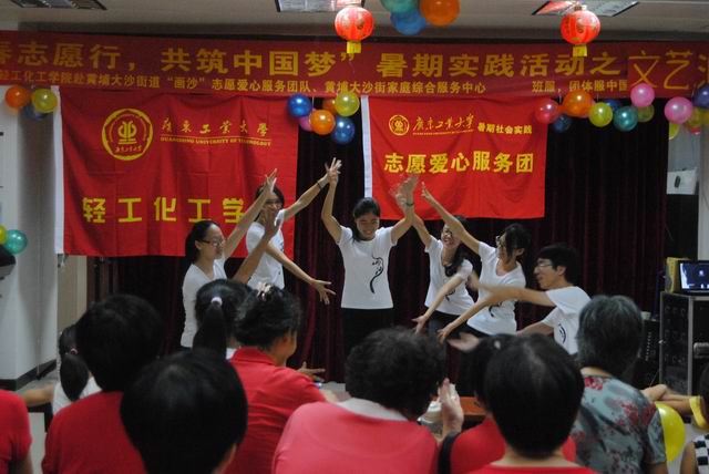 为培育和践行社会主义核心价值观,实现中国梦,以“青春志愿行,共筑中国梦”为主题的“画沙”爱心志愿服务团队,奔赴广州黄埔大沙街道社区,把“科技、卫生、文化”带进大沙。实践队员们心系中国梦,将学习“党的十八大精神”、“中国梦”落实在了这几天的实践活动中。9天来画沙队开展了趣味支教、感恩课程、社区调研、科学实验、老人联欢会等。其中的实验课、武术课、工疗手工课等课程广受孩子们喜爱。服务期间虽遇上台风,但不减队员服务的热情。在下乡的九天里,队员们奔波劳累,精心准备,收获的是丰硕的实践成果,“中国梦”得靠每一个中国人的努力奋斗,并靠我们每个中国人加入到实践中。