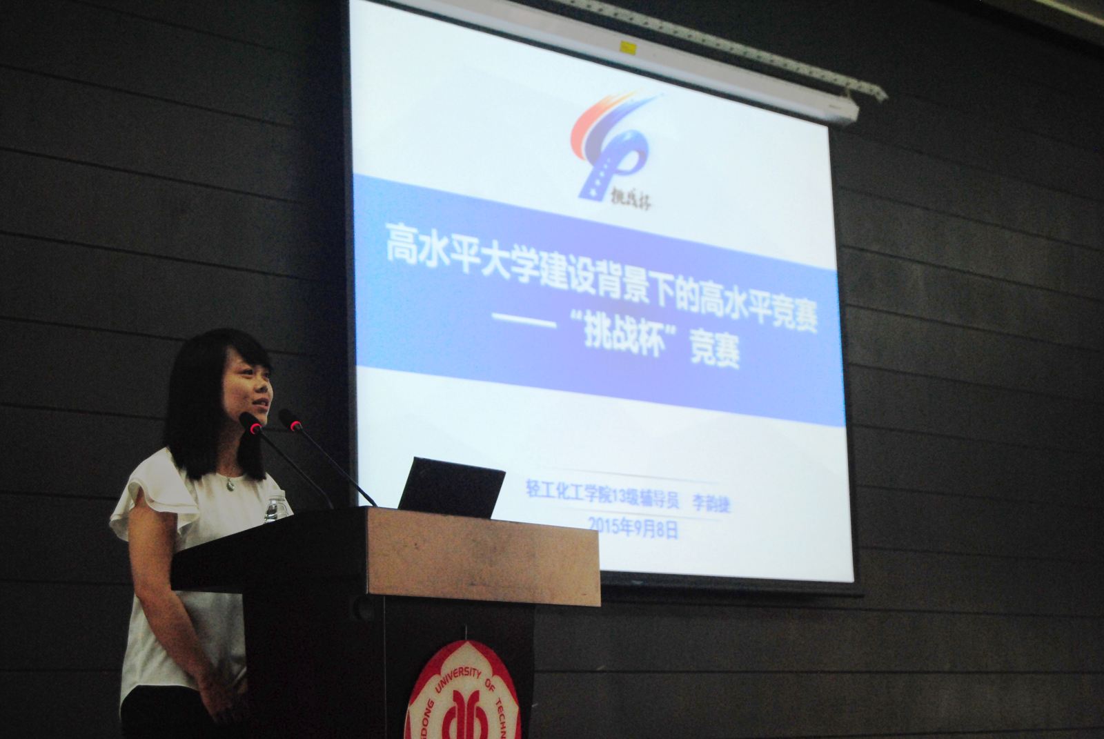 学院辅导员李韵捷老师作为我校挑战杯志愿者招募工作的宣传大使,在会上详细介绍了挑战杯的重要意义与发展历程,鼓励新生了解挑战杯、学习科技创新,积极助力我校第十四届挑战杯。