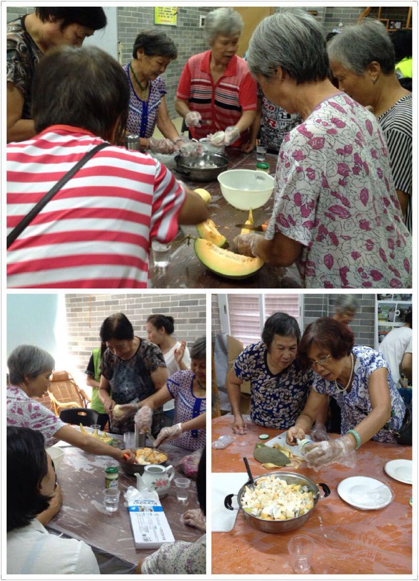 在主持人的一声令下,长者们就开始熟练地拿起手中的水果,去皮、切块放进盘子里,过程干净利落,刀工精湛,刀法流畅,另一边把酱料加进去,用筷子开始搅混。当然我们也没有闲着,都加入到水果沙拉的制作大队中。不一会儿,一盘盘美味可口的水果沙拉就出炉了,不得不称赞长者们的手艺,连我们都‘食过翻寻味’(吃完还想吃)。“一分耕耘一分收获”吃着自己辛苦劳动的成果,眉开眼笑的长者们都举杯cheese,庆祝自己的努力。当然我们都继承光盘行动,节约粮食的优良传统,随着迅速光盘的水果沙拉,这次的长者联欢会也进入了尾声,不得不说,水果沙拉这种健康美味简单的食物不仅受到年轻人的青睐,长者们也非常喜欢,而且对身体好。