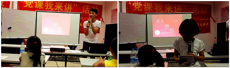 党员实践队成员周富城给社区儿童带来一堂《我的中国梦--我有一个梦想》的分享课程。课堂上,小老师首先给学生们讲解了中国梦的内涵与由来,同时由自身经历生动阐述梦想对于国家和个人的重要意义,从而启发大家去思考自己的梦想并引导如何勇敢实现自己的梦想。