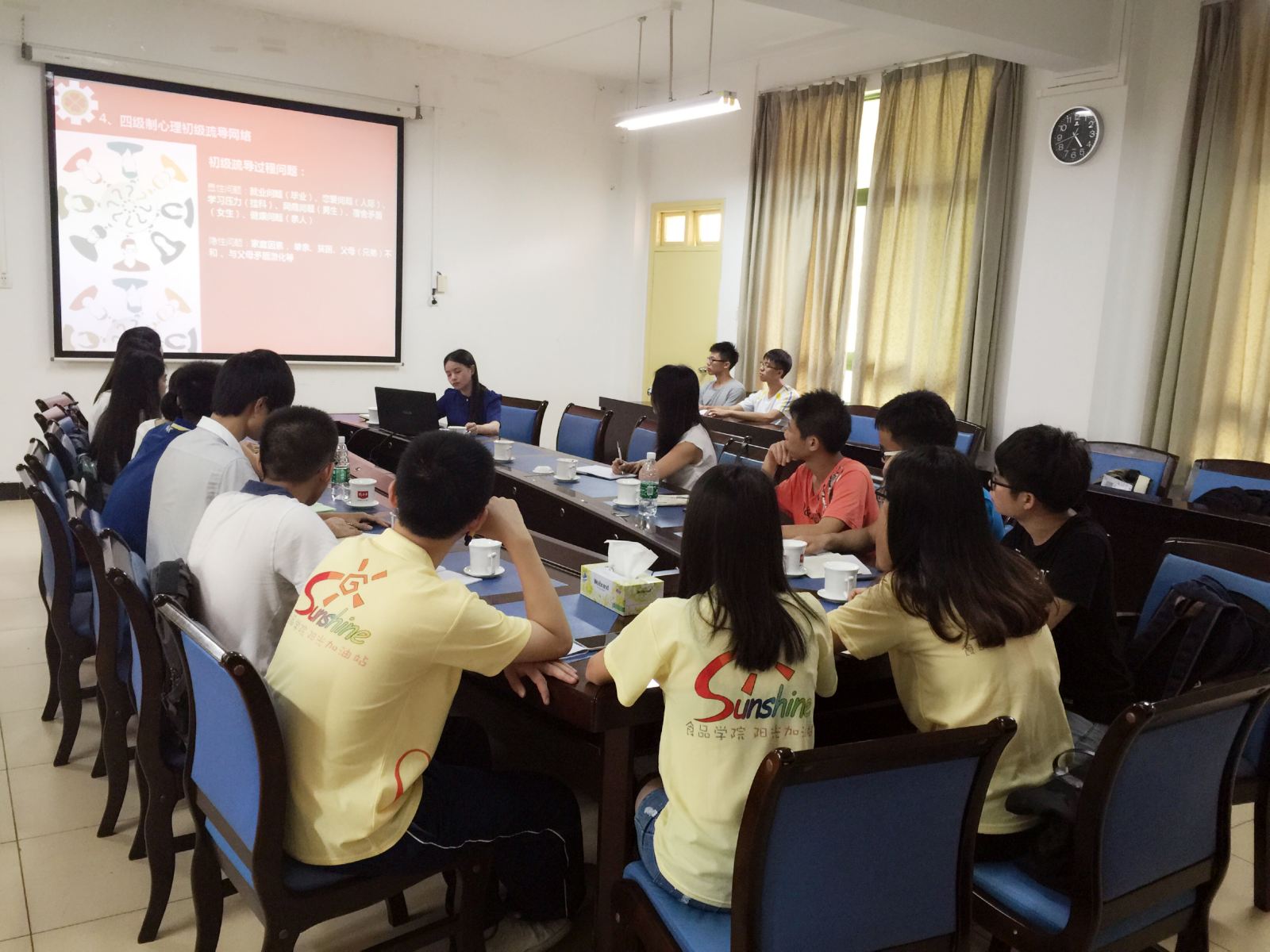 心协的特色活动“阳光学习站”、“阳光驿站”、“阳光俱乐部”、“阳光心语”四个模块做了介绍,并提出目前遇到的瓶颈与困惑。随后两院对朋辈心理辅导员的工作模式、新生心理健康工作的开展、心理健康进社区等问题进行了交流与探讨。