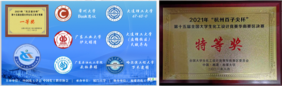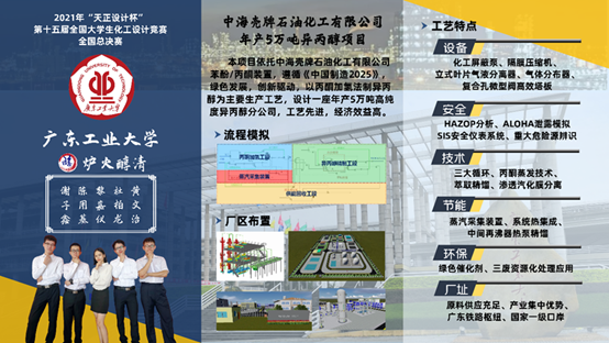 炉火醇清团队的 “中海壳牌石油化工有限公司年产5万吨异丙醇项目”作品(成员:谢子鑫、黄文治、陈用基、黎嘉仪、杜柏龙,指导教师:叶飞、王铁军、郑育英、张维刚、朱东雨),以工艺创新、绿色清洁、安全环保、经济合理的特色设计和精彩的汇报展示与答辩,斩获全国大学生化工设计竞赛一等奖、华南赛区特等奖。