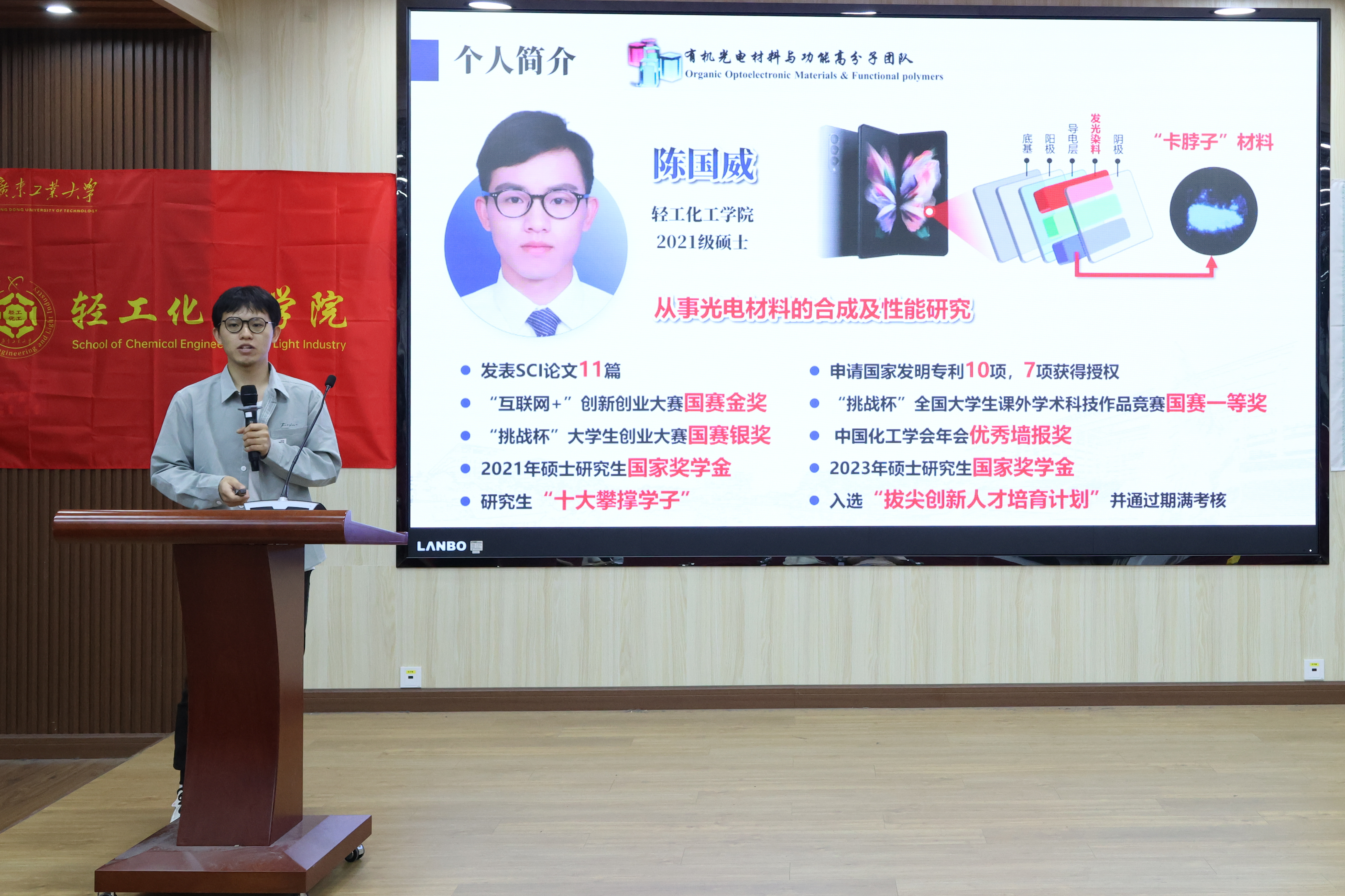 紧接着,研究生“十大攀撑学子”陈国威同学以研究生学习为出发点,分享了他在研究生阶段的学术研究和个人成长经历展示了他11篇SCI论文、10项国家发明专利的科研成果以及背后的奋斗历程,强调科研创新的重要性,鼓励同学们要保持对科研的热情,切勿急躁。同时作为团队负责人,分享自己在团队合作、时间管理等方面的心得体会,在场的同学们提供宝贵经验。