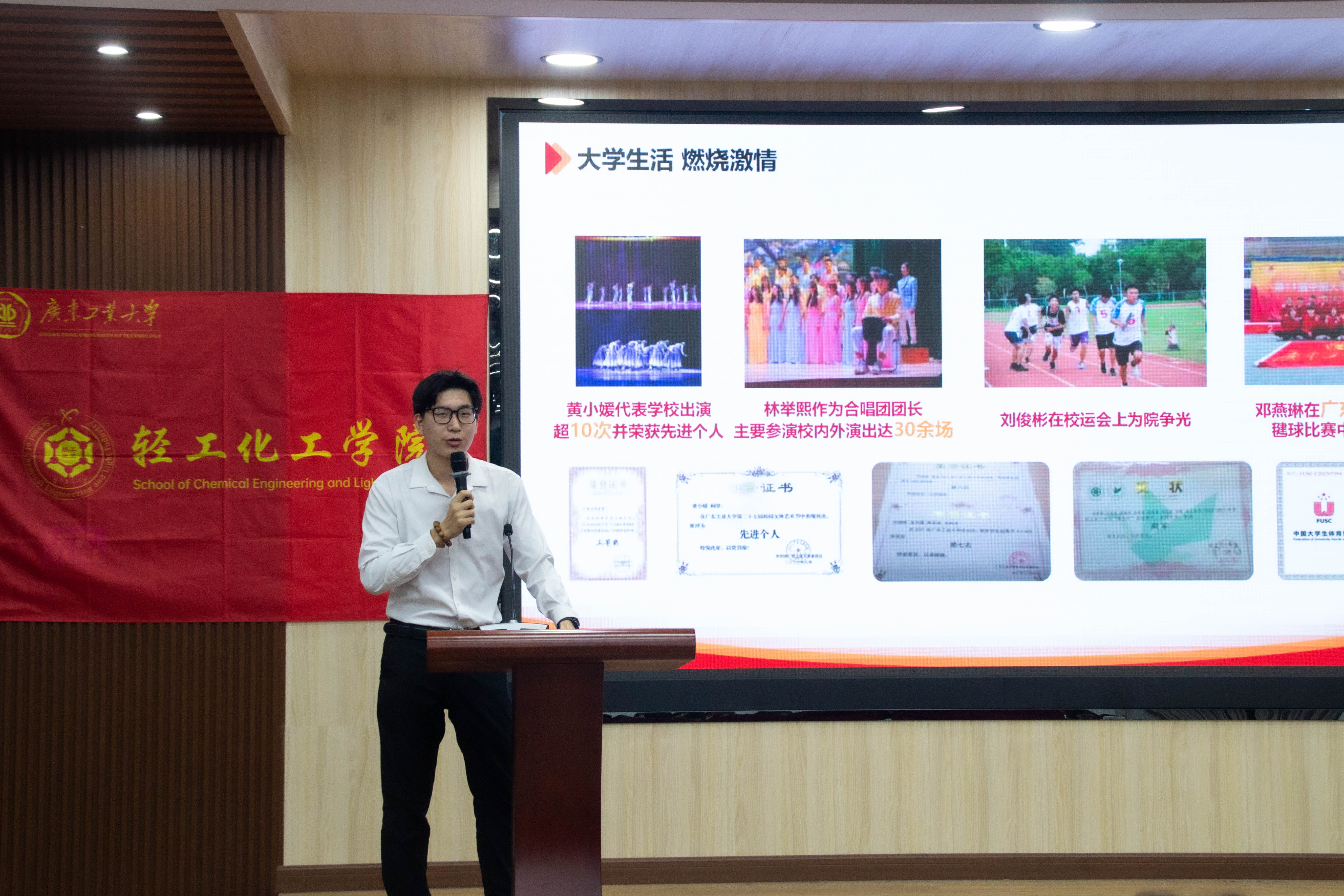 “班级之星”冯宝翀同学介绍自己的班级在学业发展和文体活动中取得的不俗成绩,并以诙谐幽默的口吻分享自己在锻炼组织协调能力和培养团队合作精神方面的故事,鼓励同学们要敢于尝试、勇于挑战,不断拓宽自己的视野和经历,争当榜样引领班级发展;也强调要养成每周运动的习惯,大学生活中要兼顾学业发展和身心健康。