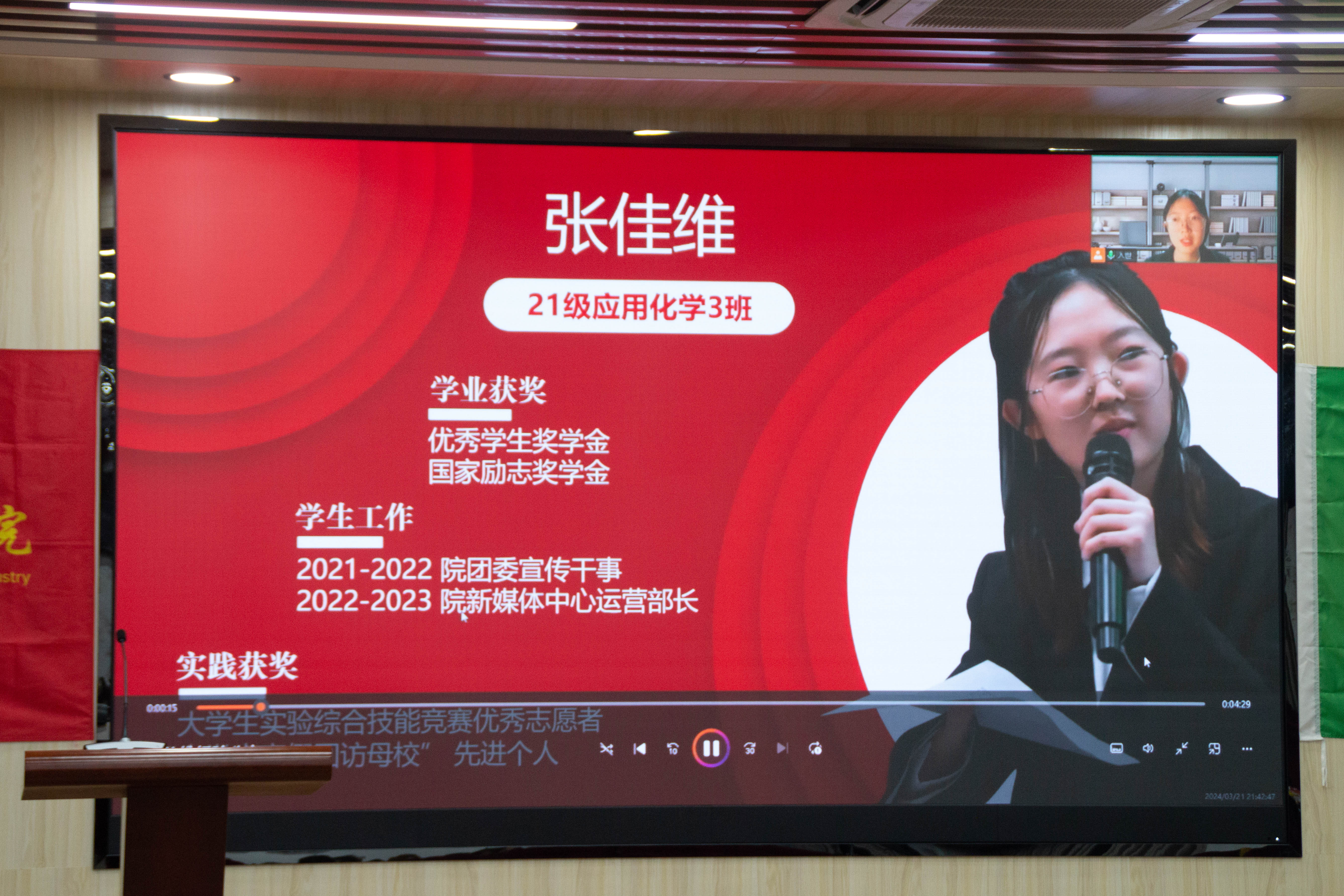 “自强之星”张佳维同学通过视频分享的方式为同学们带来了深刻的启发。她在视频中分享自己对学生工作和社会实践的理解与看法,指出夯实基础是关键,持之以恒是动力,激励同学在困境中要秉持锲而不舍、自强不息的精神,心存希望,追逐光明。