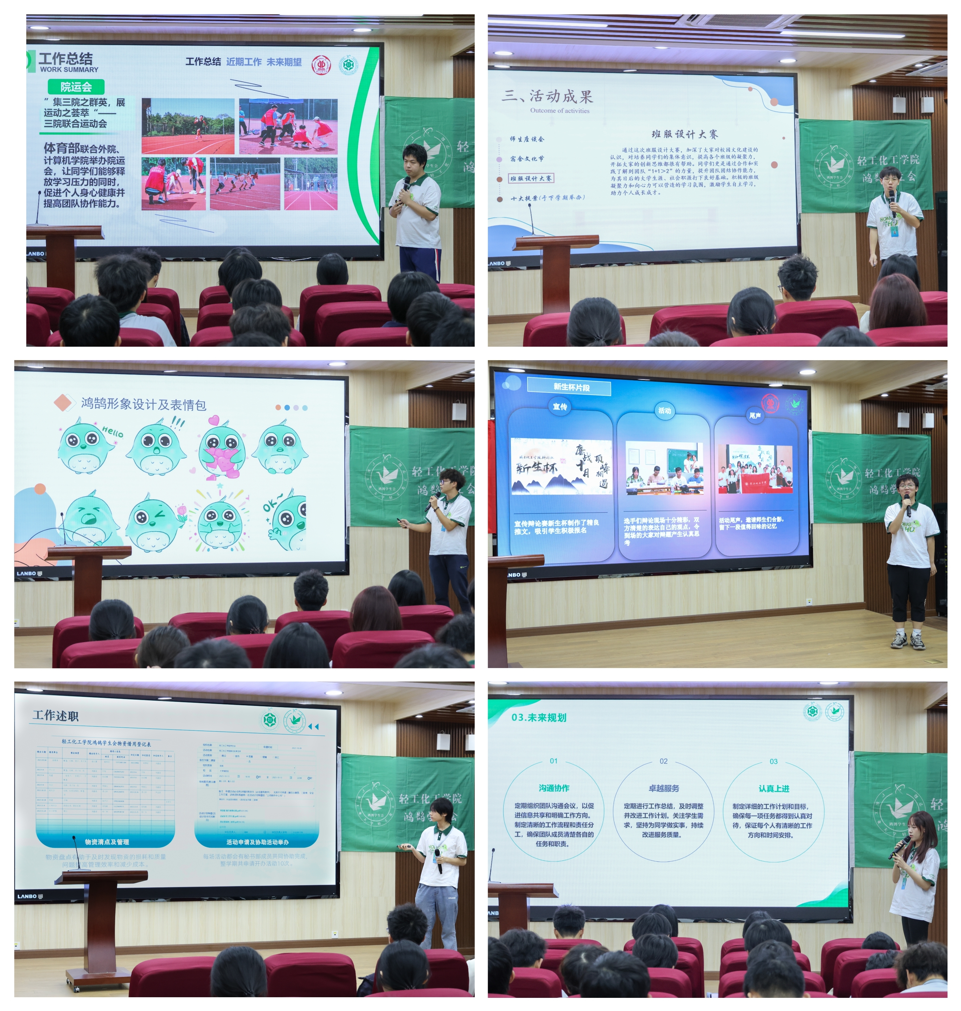 述职评议会在庄严的国歌中拉开序幕。学生会体育部、权益服务部、宣传联络部、文娱部、综合事务部、学业发展部、主席团依次述职,向大会汇报本学期院运会、四球班级联赛、师生座谈会、班服设计大赛、迎新晚会、悦享读书会、学业帮帮堂等活动的开展情况及下学期工作规划,内容详实,总结到位。