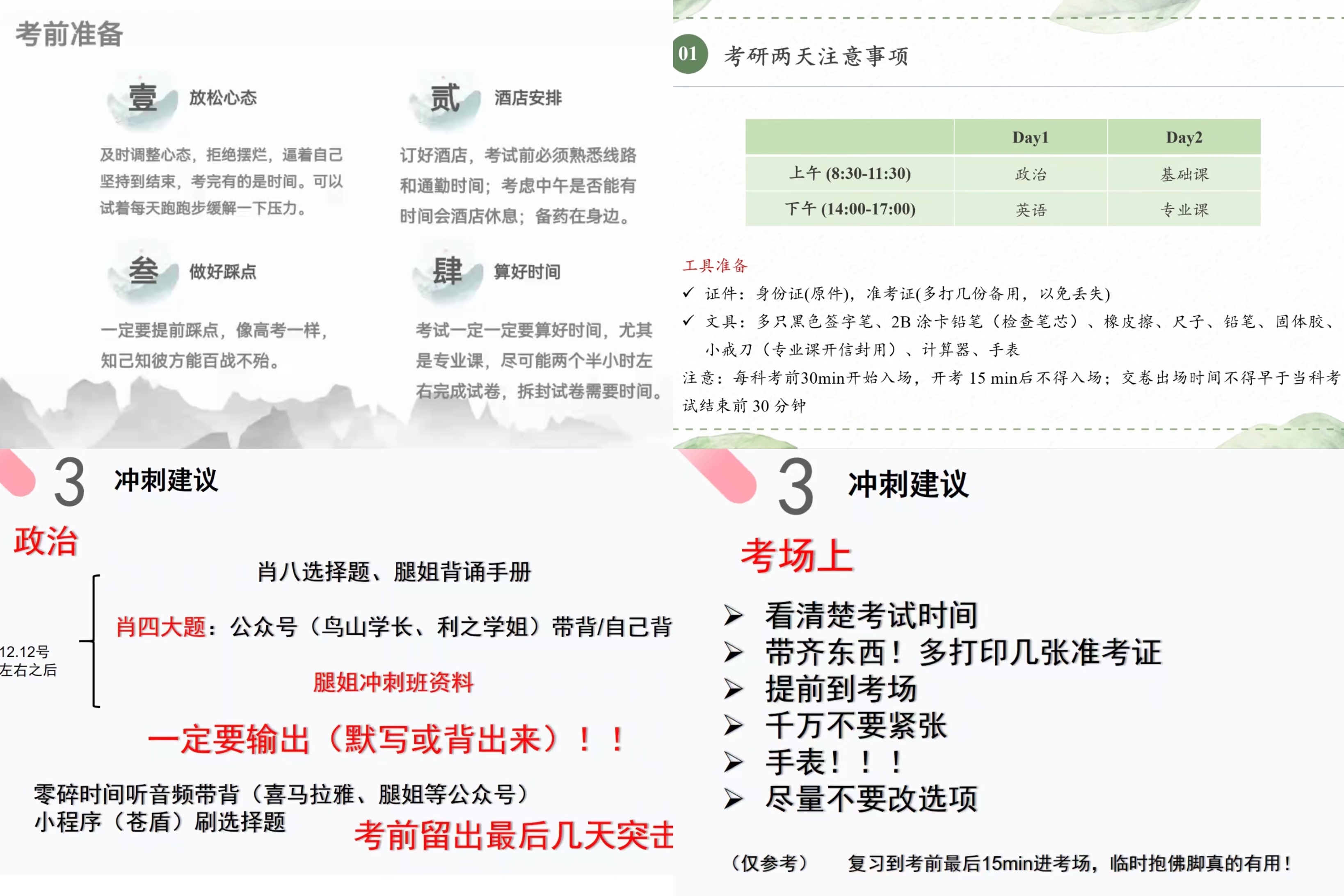 会上,胡博昊同学从公共课和专业课备考经验入手,分享了个人在最后一个月内的学习计划,并同学们提出了以下几点建议:一是放松心态,缓解压力,拒绝摆烂;二是提前订好酒店,踩点考场是规划好考试做题时间占比。黄雪同学着重分享了政治备考冲刺的经验,建议同学们利用碎片化时间背诵知识点,并列举了备考期间调整心态的方法鼓励同学们通过听轻音乐、运动等形式缓解心理压力。冼君亭同学则强调在最后冲刺阶段要多总结错题,形成解题思路,并就答题策略进行分享,建议同学们在考场上要细心冷静,不要轻易修改答案。