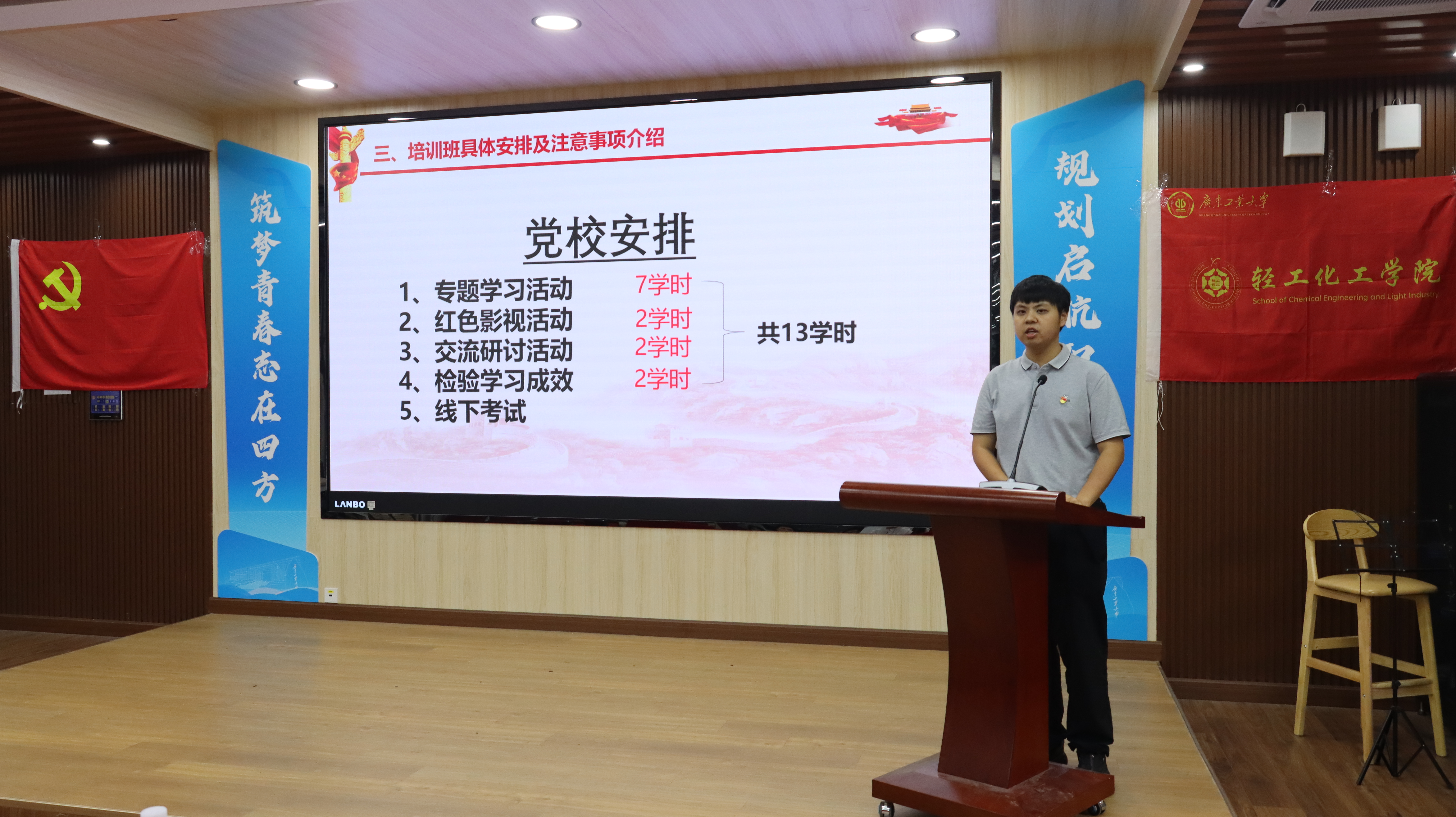 随后,冯浩宸老师详细介绍了本届党校培训班的课程安排,包括专题学习、红色影视鉴赏、交流研讨活动、线下考试、纪律要求等入党积极分子培训班的相关注意事项,希望广大学员珍惜这次培训机会,遵守相关纪律要求,认真学习,不断思考,将思想和行动进一步统一到党的二十大精神上来,为学院党员队伍的高质量发展奠定坚实根基。