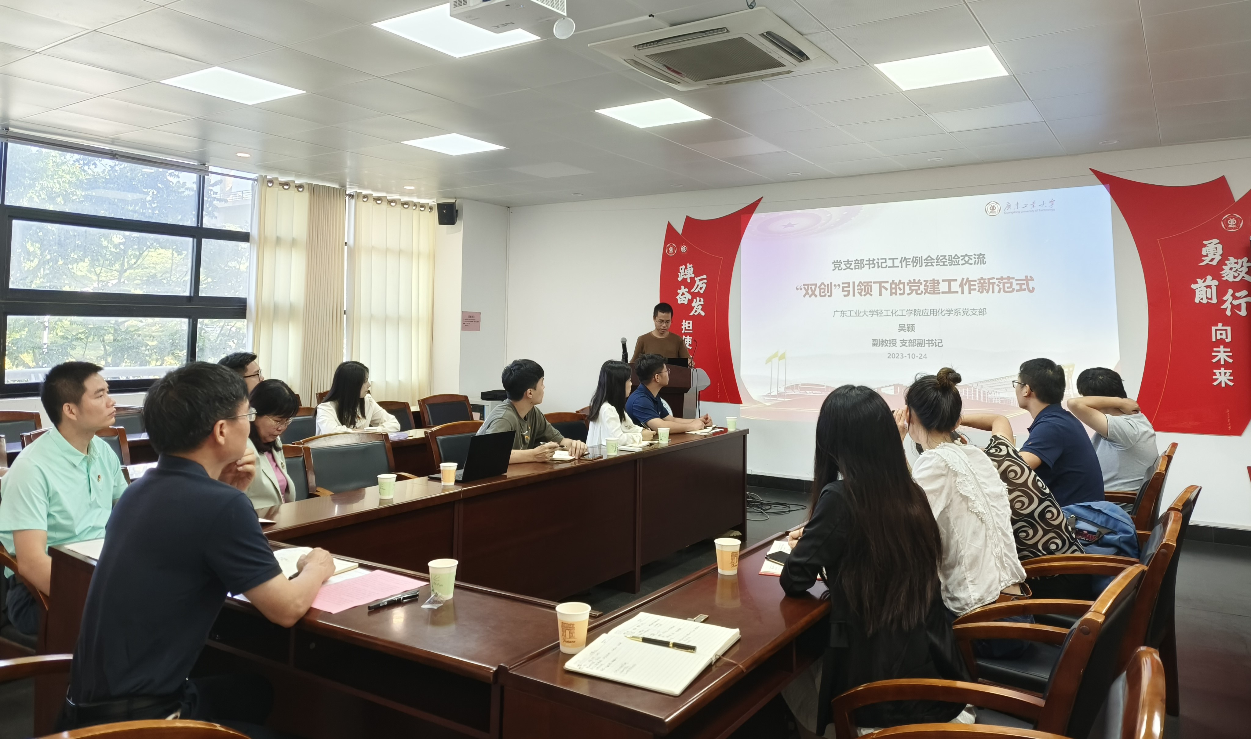 接着,获广东省第二批高校党建工作样板党支部的应用化学系党支部副书记吴颖副教授作主题分享。他以“双创”引领下的党建工作新范式为题,从支部概况、支部工作特色、工作成效三方面介绍支部建设经验。