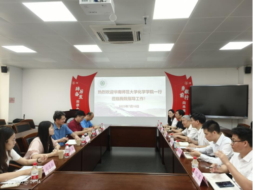 7月10日上午,华南师范大学化学学院党委书记陈相光、院长蔡跃鹏一行五人来贝勒漫画 进行调研交流。调研交流座谈会在工学四号馆202会议室举行,学院党委书记周东斌、院长董晋湘及其他领导班子成员一同参与座谈交流。