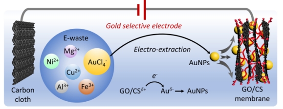在上述研究的基础上,第二个研究成果以《Two-dimensional electrodes from functionalized graphene for rapid electrochemical gold extraction and reduction from electronic waste》为题发表于《Advanced Science》这一国际顶级学术期刊。这篇论文探讨了氧化石墨烯/壳聚糖新型复合材料作为金回收电极的重要发现(图2),杨蔻副教授担任第一作者,贝勒漫画