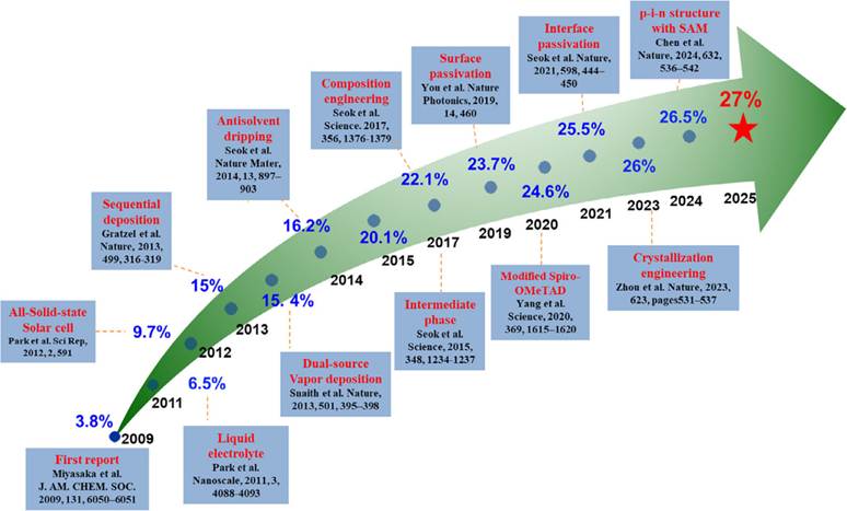 Figure2. The efficiency improvementtimeline for perovskite solar cells.