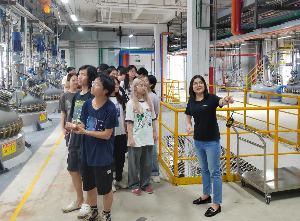 师生前往企业生产基地参观调研,深入了解产线精细化管道结构以及反应釜的工作原理,参观学习蒸馏塔与绿色溶剂回收模式,对生产线运营模式有了更深刻的认识。