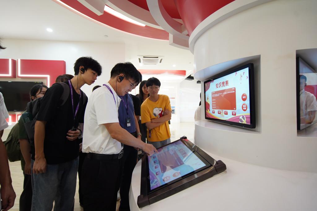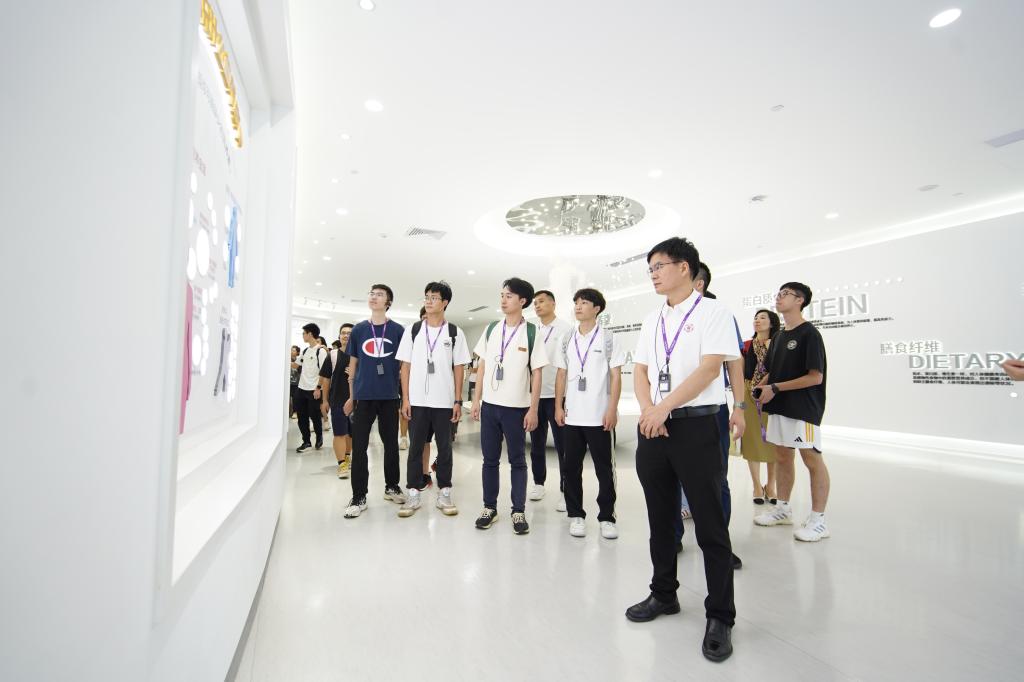 在汤臣倍健股份有限公司透明工厂,解说员和校友代表带领贝勒漫画