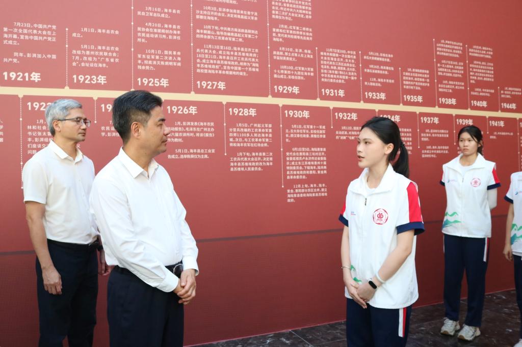“轻”春传承党员实践队队长邱丽婷同学向胡钦太书记一行汇报了队伍人员构成、实践活动目的意义和开展情况以及预期成果,表示实践队以读懂中国-弘扬“五老”精神为指引,深入挖掘海丰县红色文化资源和“五老”群体在爱国主义教育、基层治理和乡村振兴等方面的典型案例,进一步发挥“五老”群体在青少年理想信念教育等方面的特殊优势和作用,让革命传统和优良作风薪火相传。