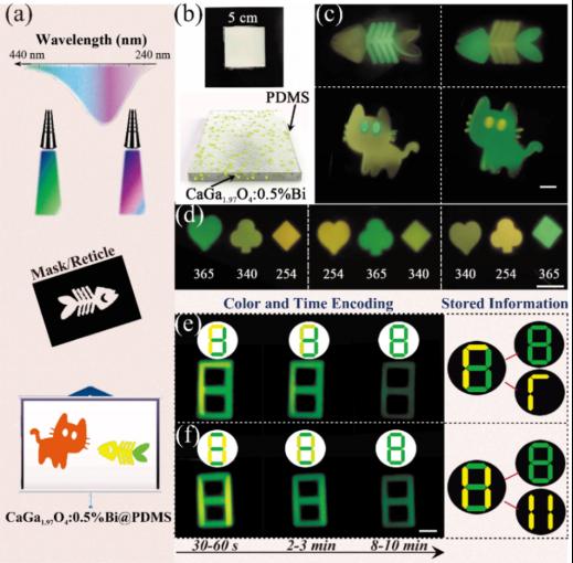 基于光学性能可调可控的长余辉发光材料在紫外光感知、信息显示与加密中极具应用价值。然而,在化学性质稳定的无机材料体系内实现单组份、多模态、色彩动态可调的长余辉发光面临艰巨挑战。研究团队基于缺陷工程的设计理念,通过非化学计量组分设计引入阳离子空位缺陷,在无机晶体结构中形成了多发光中心与多陷阱中心构成的微环境,这些微环境分别响应不同的激发光并将能量存储在局域结构中,最终通过热振动或隧穿效应逐渐释放能量并产生“橙黄绿”连续可调的余辉发光。结合实验与理论分析阐明了激发波长刺激响应的多色余辉机理。并利用材料特有的激发波长依赖的多色余辉特征,展示了基于激发方式、余辉颜色和时间分辨的动态光学信息读写与显示,所开发材料及验证方式揭示了其在先进防伪及光学信息显示与加密领域的应用潜力。