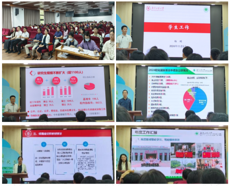 会上,对于当前的重点工作,学院领导分别就党的建设与思想政治工作、师资队伍、学生工作、研究生工作、学科建设、本科教育教学、科研、实验室建设等作了强调和部署。会议强调,全院师生要围绕学校提出“双一流”建设目标,学习贯彻党的二十届三中全会和习近平总书记的重要讲话精神,以立德树人为根本任务,强化安全底线思维,扎实做好本职工作,为学院发展和高水平创新型大学建设作贡献。