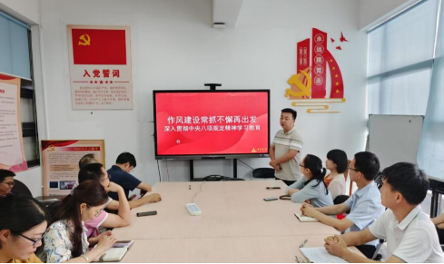 6月17日下午,化工系党支部于工学四号馆601会议室开展深入贯彻中央八项规定精神学习教育专题学习会,支部副书记董飞飞作题为《作风建设常抓不懈再出发-深入贯彻中央八项规定精神学习教育》微党课,学院党委书记周东斌参会指导支部建设工作,支部委员、党员同志参加会议。