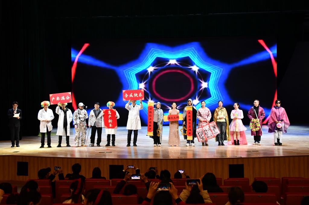 基础教学中心郭禹希老师的古筝独奏《汨罗江山》,琴声淙淙,典雅悠扬,令人仿佛置身山水画卷。实验中心全体教师献上舞蹈《踏山河》,动作刚劲有力,气势恢宏,展现出理工科教师别样的豪情与风采。化学系尹家福、梁宇皓等老师的诗朗诵《我的祖国》,情感饱满,声情并茂,抒发了深厚的家国情怀。应化系教师的创意T台秀《‘化’样年华,天团‘秀’新春》,将专业元素与时装走秀巧妙融合,造型新颖别致,自信步伐闪耀舞台。