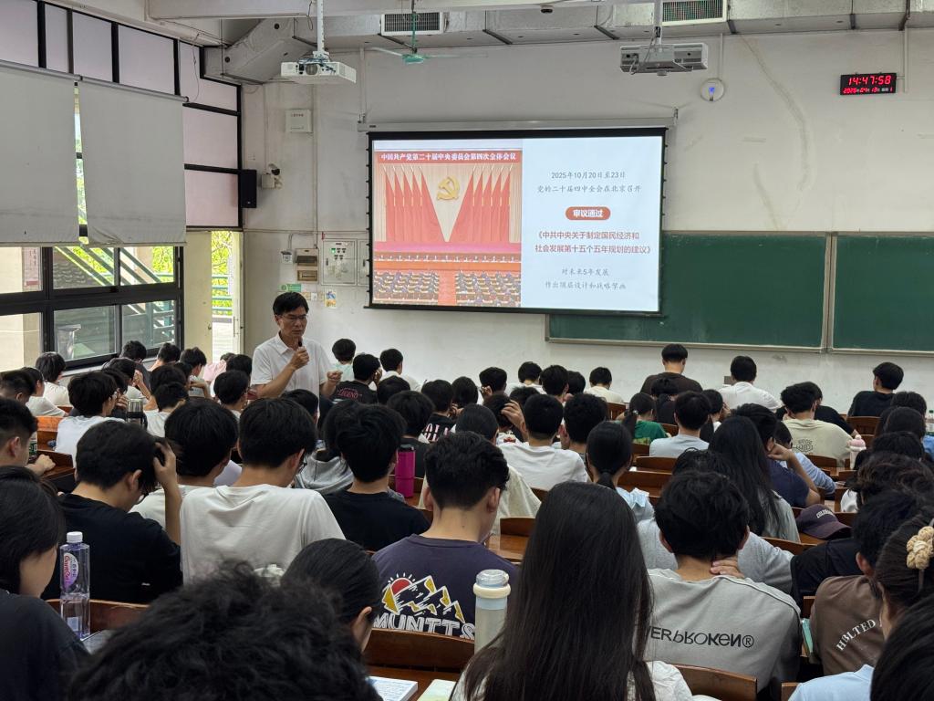 周东斌从学校当前正处于冲击“双一流”建设关键期切入,指出这一进程与每一位学子息息相关。他结合学校发展现状与学院学科特色,阐释了学生在助力“冲一流”中的可为之处,强调个体的成长与学校的发展互为支撑、彼此成就。随后,他围绕“推进中国式现代化与‘十五五’规划”展开讲授,系统梳理了五年规划的历史沿革与制度优势,深入分析了当下面临的形势与挑战,并对规划的重点内容与战略布局进行了详细解读。
