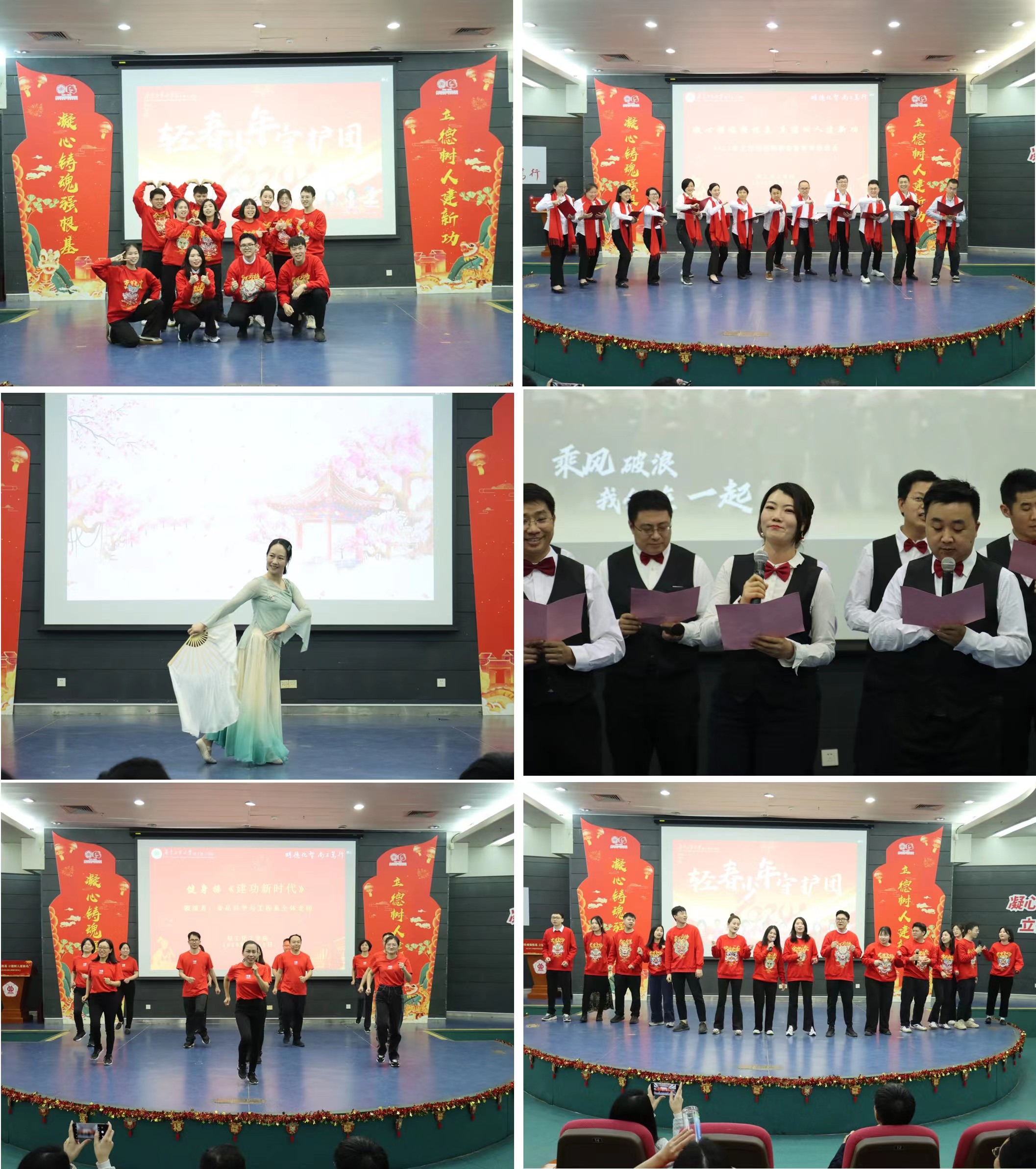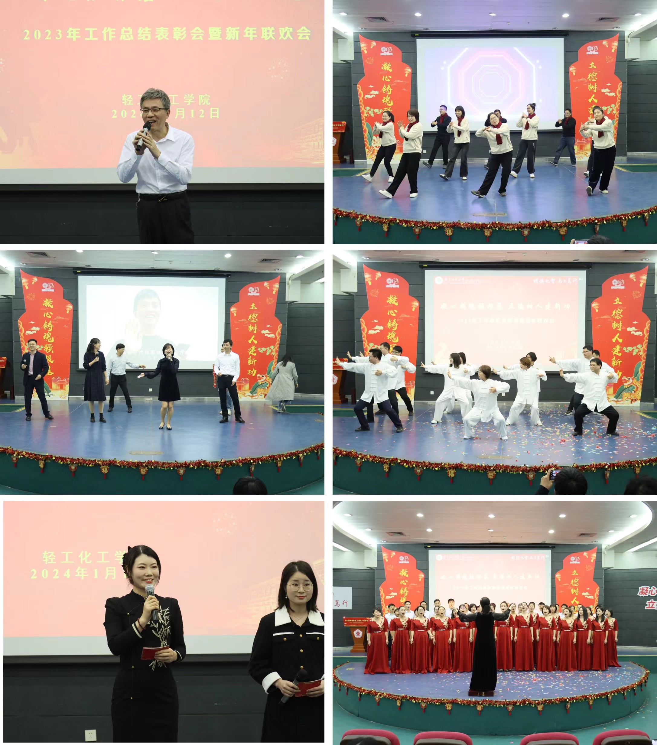 随后进行的是学院教职工新年联欢会。联欢会汇聚教书、育人、科研工作的点滴,一场视听盛宴充分展示了教职工多姿多彩的精神风貌。学工团队首先带来《相亲相爱》歌舞串烧,一曲充满活力的抖音舞蹈拉开联欢会的帷幕。应化系老师诗朗诵《你幸福吗》,激情洋溢的同时,也不失幽默澎湃。党政办老师表演《梁祝》古典独舞,舞姿优美婉转,勾勒出多情的画面。化工系老师合唱《少年》,唱响青春的激情与浪漫。食品系老师带来《建功新时代》健身操充分展现学院教职工积极向上的生命活力。党政办老师联唱歌曲《火热的凤凰》,激情四溢,唤起热烈情感。实验中心老师的一曲独唱《再与天比高》,嘹亮的歌声在会场回荡;《恭喜发财》歌舞串烧,欢快的旋律营造出欢愉的氛围。能源化工系老师《回忆淘金》歌曲串烧勾勒出过去的美好。基教中心老师的传统武术八段锦为联欢会增添了一份宁静与祥和。化工系师生联手带来《当我真正爱自己》诗朗诵,情感真挚,唤起共鸣。联欢会最后,学院教师合唱团齐唱《万疆》和校歌《逐梦》,将联欢会的氛围推向高潮。