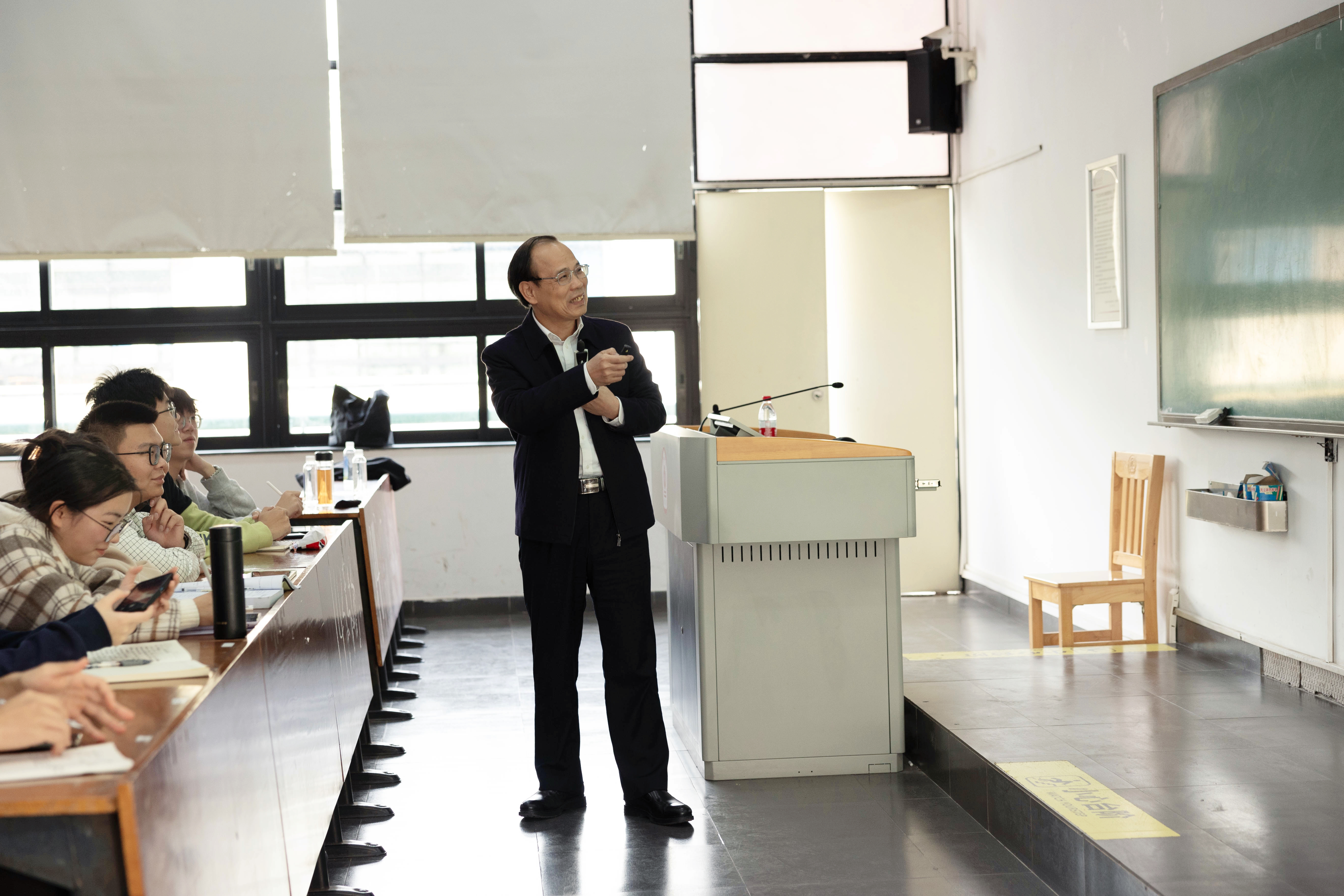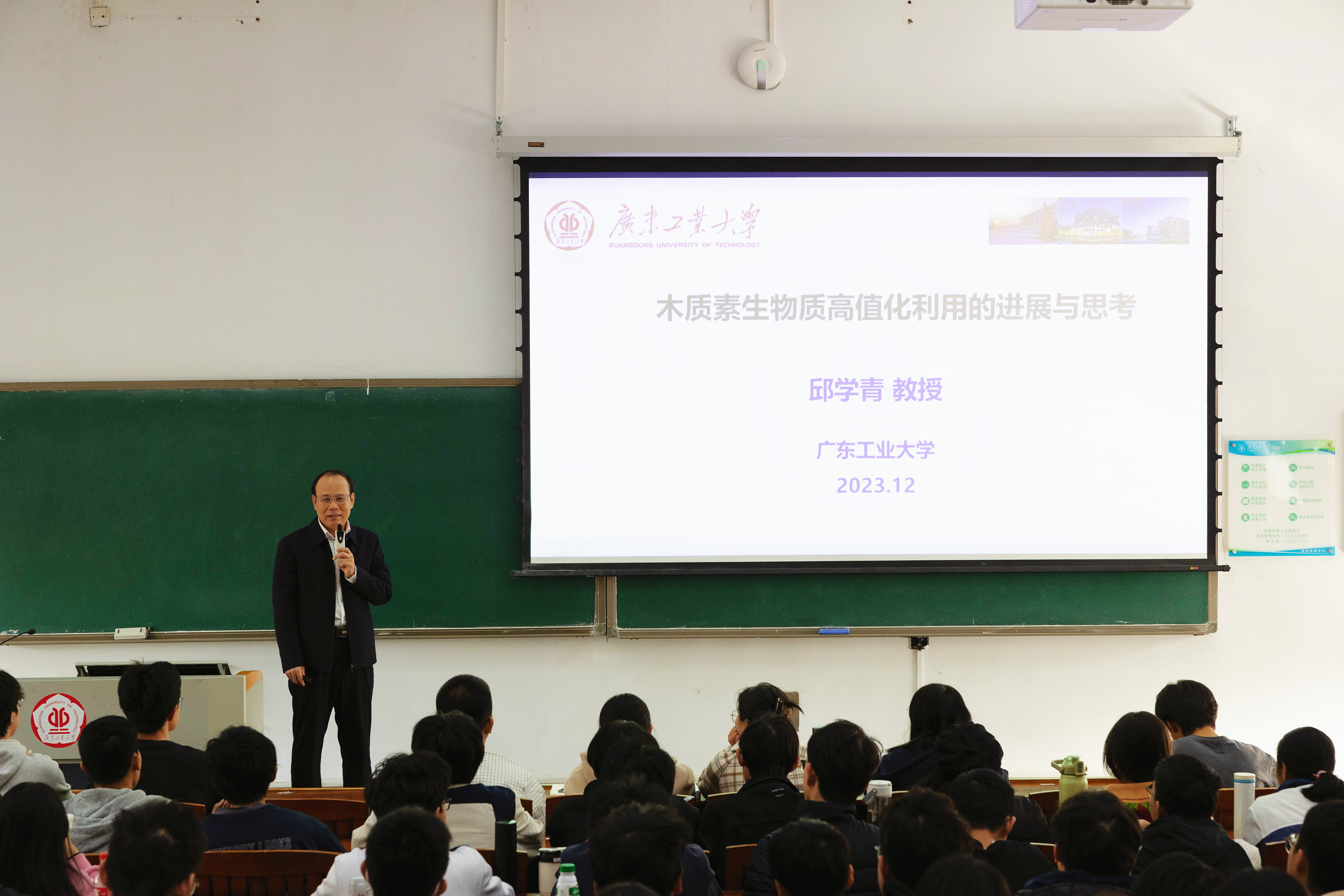 随后,邱校长为同学们介绍了木质纤维素的来源及利用和发展现状,以及其课题组二十多年来工业木质素高值化利用应用的研究成果,包括表面活性剂、燃料、酚类化学品、高分子材料、碳材料等。授课过程中,邱校长不但为同学们介绍科研成果,还为同学们的学习和生活提出了建议。邱校长鼓励同学们要以批判态度听报告等,要培养自身深入思考的能力,敢于质疑;不要有畏难情绪,辩证地认识“难”,研究木质素尽管很难,但它给了我们一个具有挑战性课题,提供契机。