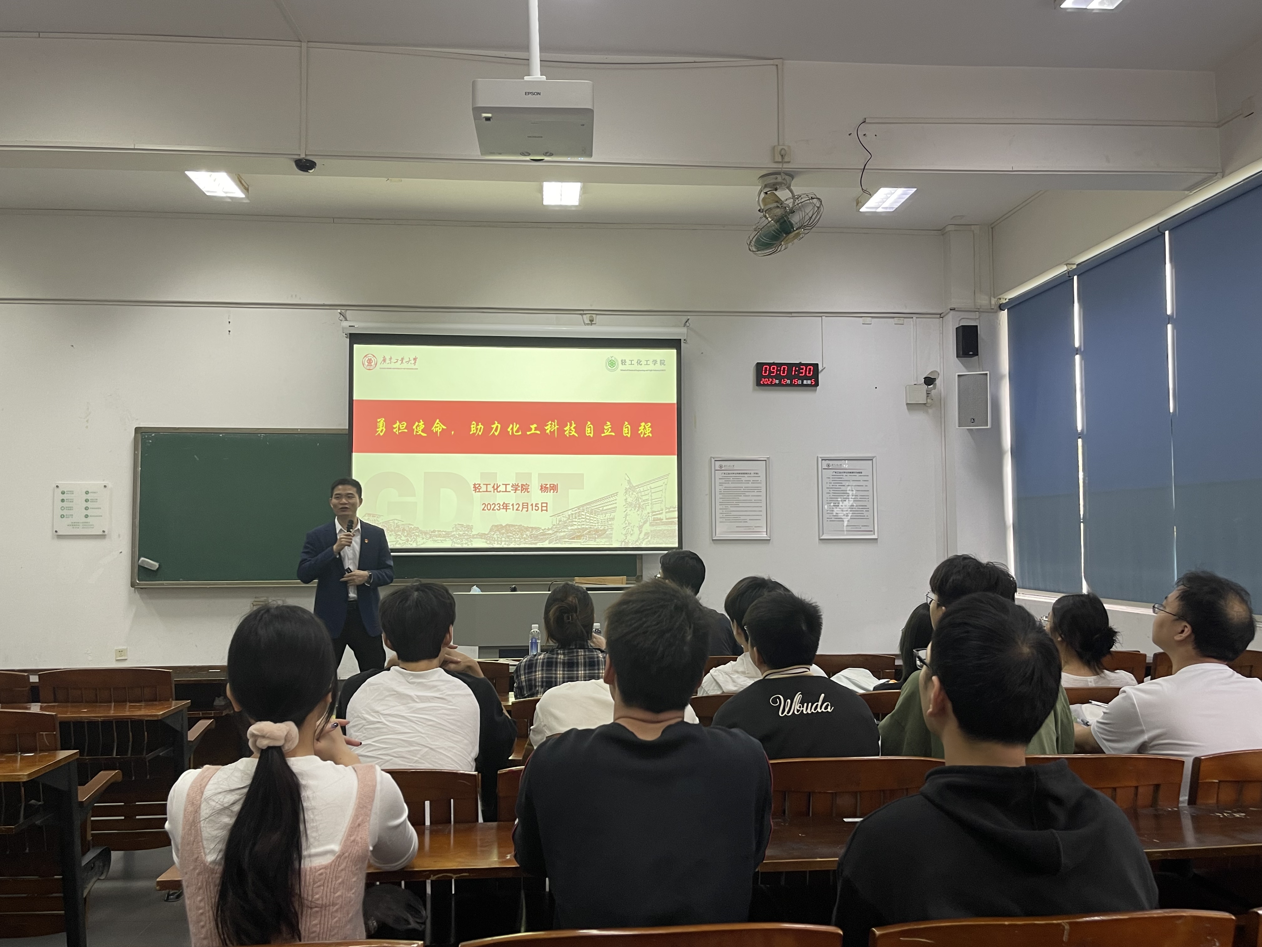 随后,杨刚老师又通过对比现阶段国内外化工产业的数据,指出我国目前仍然面临着“低端过剩、高端不足”的结构性问题,存在亟需加强关键核心技术研发、解决‘卡脖子’的技术难题、完成产品国产化替代的时代任务。杨刚老师通过案例分析、现场互动等方式与同学们展开探讨了化工行业的发展方向和未来前景,让同学们更加深入地了解了化工行业的现状和发展趋势,增强了大家的责任感和使命感。