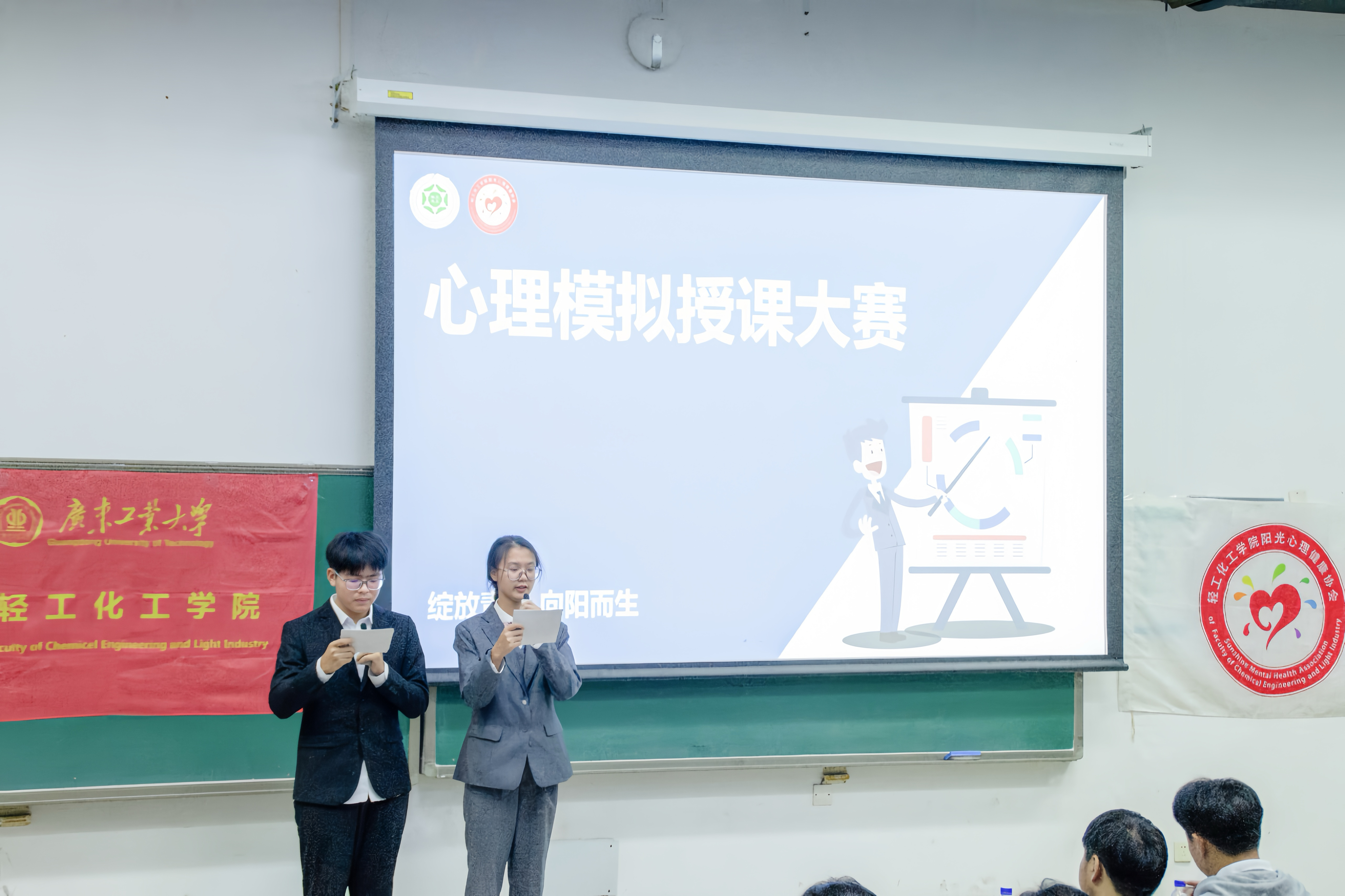 在精彩的比赛中,18支队伍自信地展示了他们的授课内容,让评委和观众耳目一新:应化四班代表队提出了“乔哈里窗口理论”,可以帮助我们有效地处理非和谐的人际关系,提升个体的自尊心,从而发挥出积极正面的作用;化工三班代表队提出“弗洛伊德的人格结构理论”,帮助同学们提升自我认识;以暖场视频为桥梁,应化一班代表队以一个极具画面性的不完整的圆开篇,引出了“不完美才美”的主题并鼓励同学们要勇于接纳自己的不足。