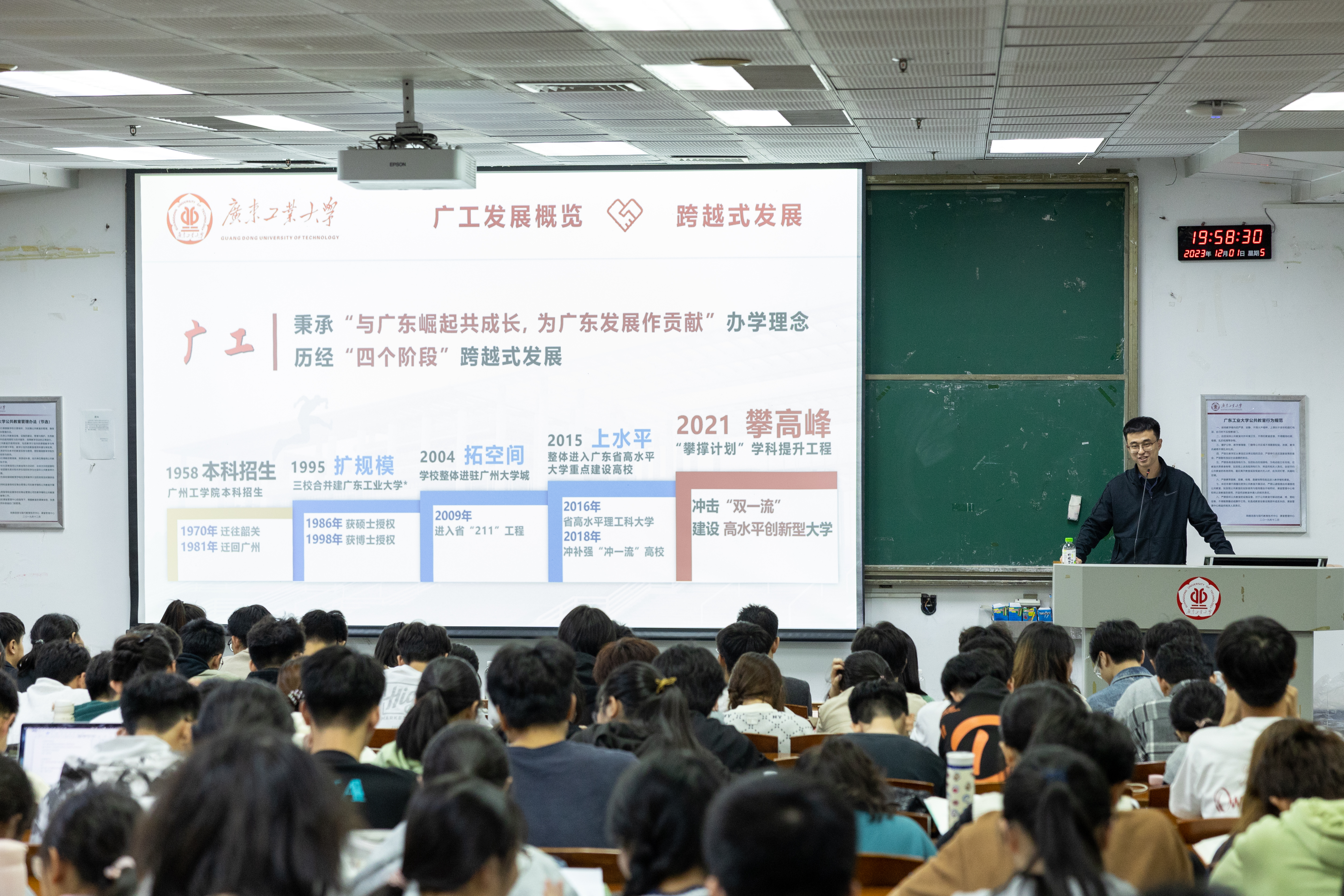 于1995年由广东工学院、广东机械学院、华南建设学院(东院)三校合并组建的发展历史;学习了曾志、郭大同、孙再昭等前辈为我校发展作出了巨大贡献及获2021年“时代楷模”称号的东深供水工程建设者群体彻底解决几百万香港同胞饮水问题的光辉事迹;见证了我校“扩规模”“拓空间”“上水平”“攀高峰”历史性跨越。赵曜老师以我校办学以来栉风沐雨、初心不改的峥嵘岁月及“1+2+3”攀撑计划学科提升工程的宏伟蓝图激励学生骨干们传承红色基因,赓续红色血脉,团结、勤奋、求是、创新,勇当广工发展的奉献者。