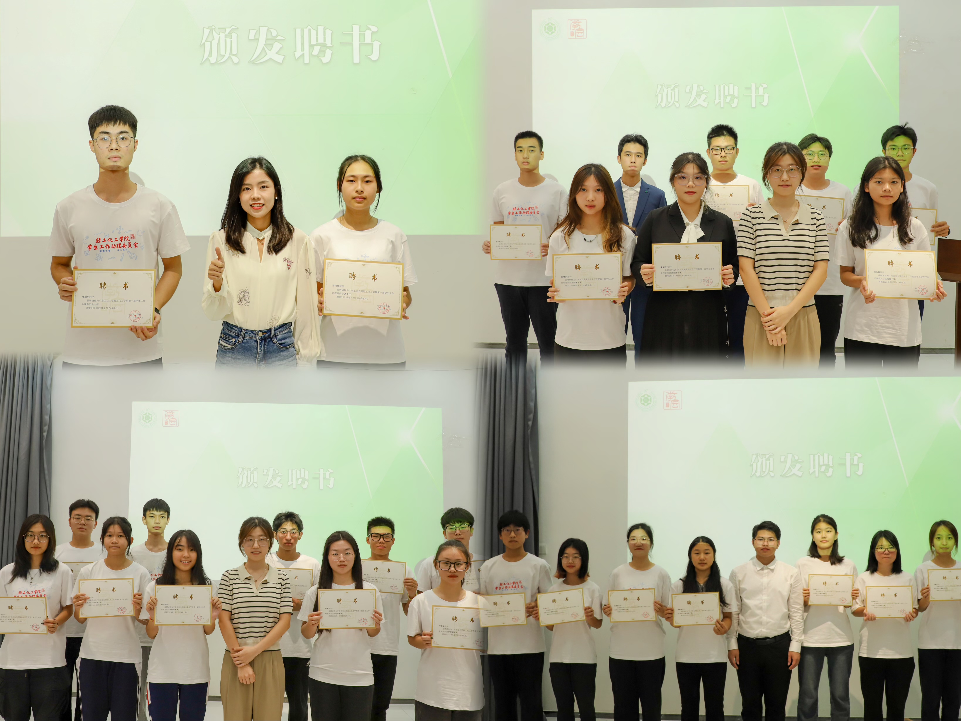 最后,主持人宣读新一届学生工作助理委员会骨干名单,林沛老师、李舒老师和赖振鑫老师分别为各部门学生骨干颁发聘书。