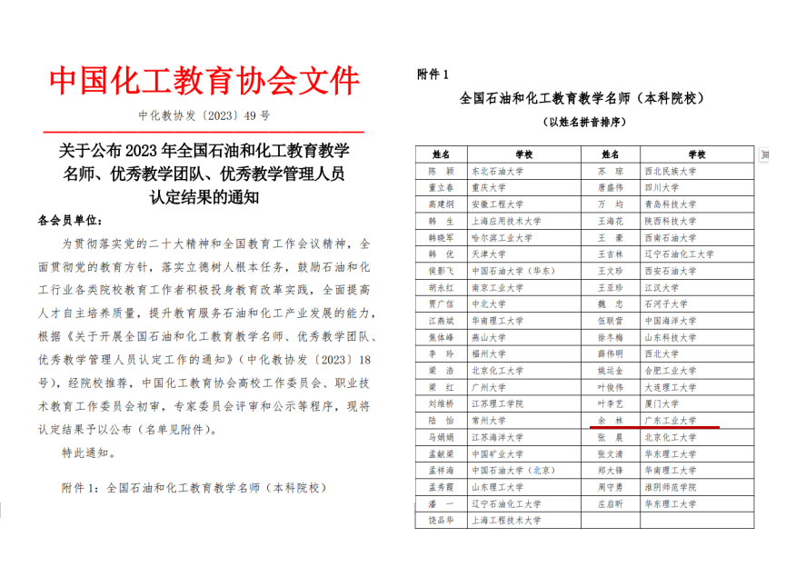 近日,中国化工教育协会公布了2023年全国石油和化工教育教学名师、优秀教学团队的认定名单,贝勒漫画 余林教授荣获2023年“全国石油和化工教育教学名师” 荣誉称号。