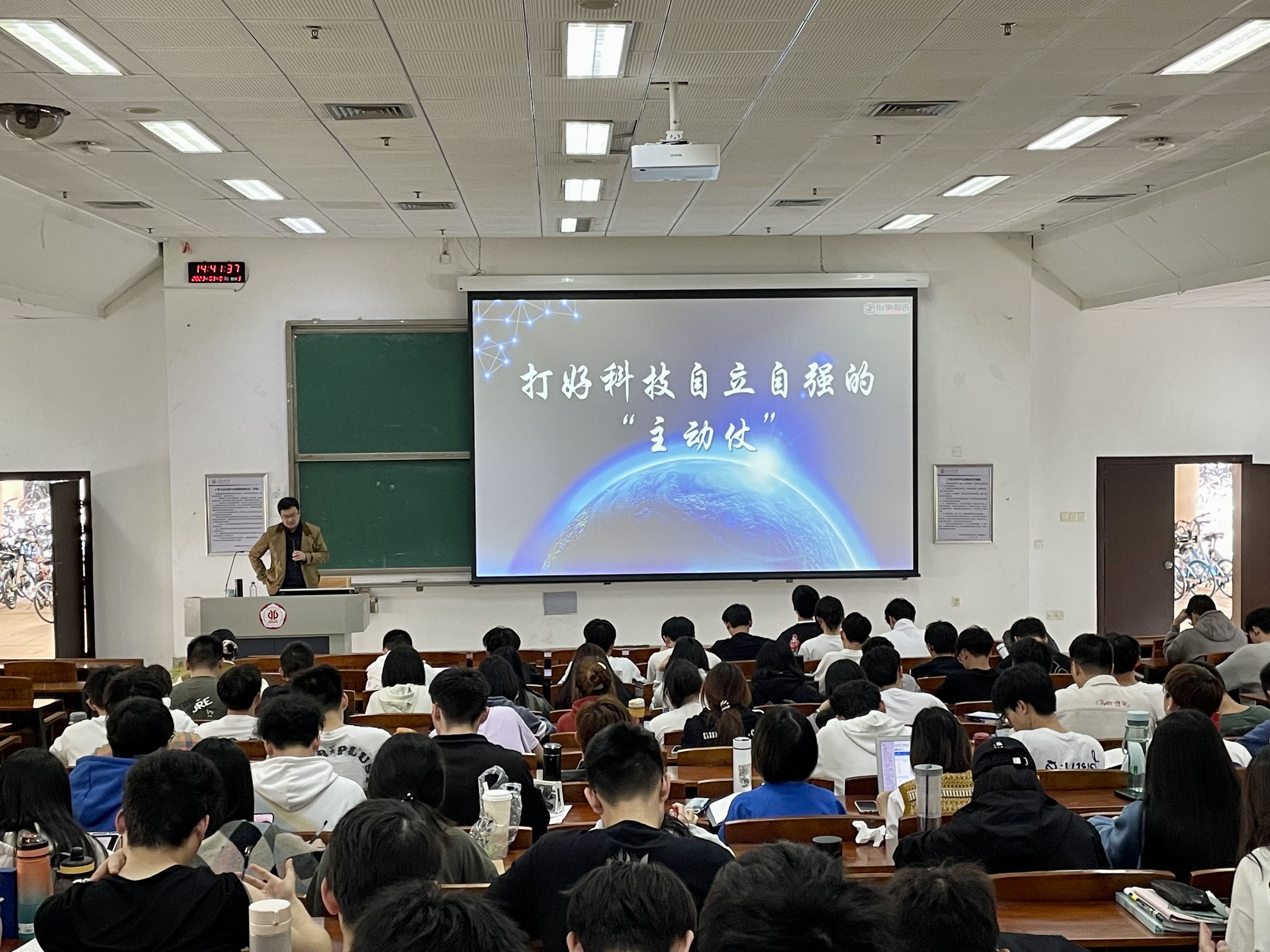 王铁军老师以《打好科技自立自强的“主动仗”》为题,围绕当前世界科技发展形势、我国的科技发展水平和特点、实现科技自立自强的战略举措三方面解读了科技自立自强对我国发展的重大意义。指出同学们作为新时代青年,要心怀梦想、脚踏实地;要扎根科研,矢志创新;要敢作敢为,善作善成,不断提升科技报国的使命感和能力本领,为高水平科技自立自强、打好关键核心技术攻坚战贡献青春力量。
