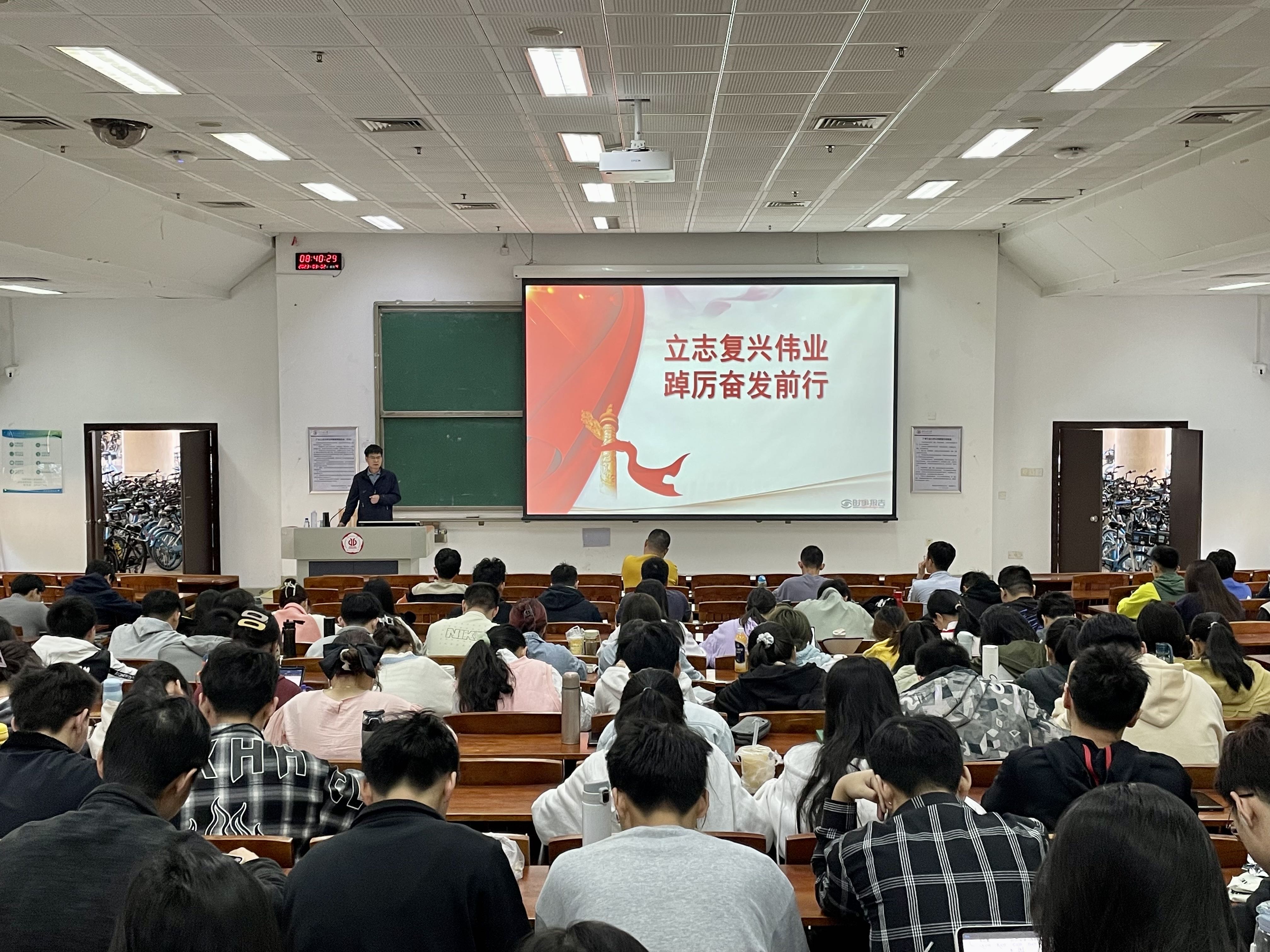 周东斌老师以《立志复兴 踔厉奋发前行》为题,以党的二十大报告的逻辑框架为主线,以新理论、新论断、新判断为线索,从永载史册的伟大变革、引领复兴的宏伟蓝图、笃行不怠的战略定力、光荣梦想的时代呼唤四个方面向同学们讲解时代的伟大变革,希望同学们牢记习近平总书记的殷切嘱托,踔厉奋发、勇毅前行,自觉投身于高质量发展新实践,让青春在新征程上书写光荣与梦想。并勉励同学们要厚植家国情怀、涵养进取品格;构建优良学风,提升文明素养;汲取榜样力量,砥砺奋进前行。
