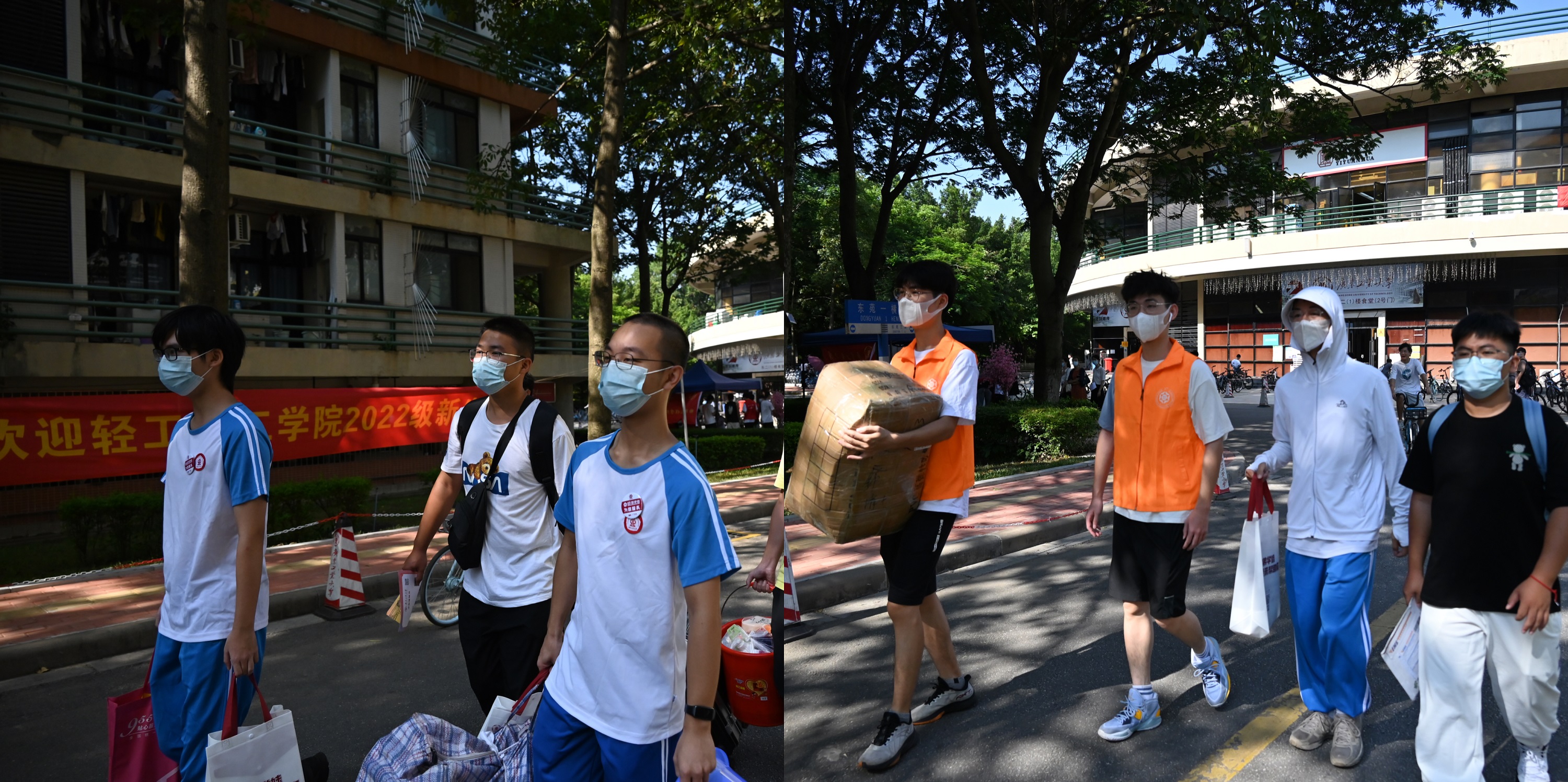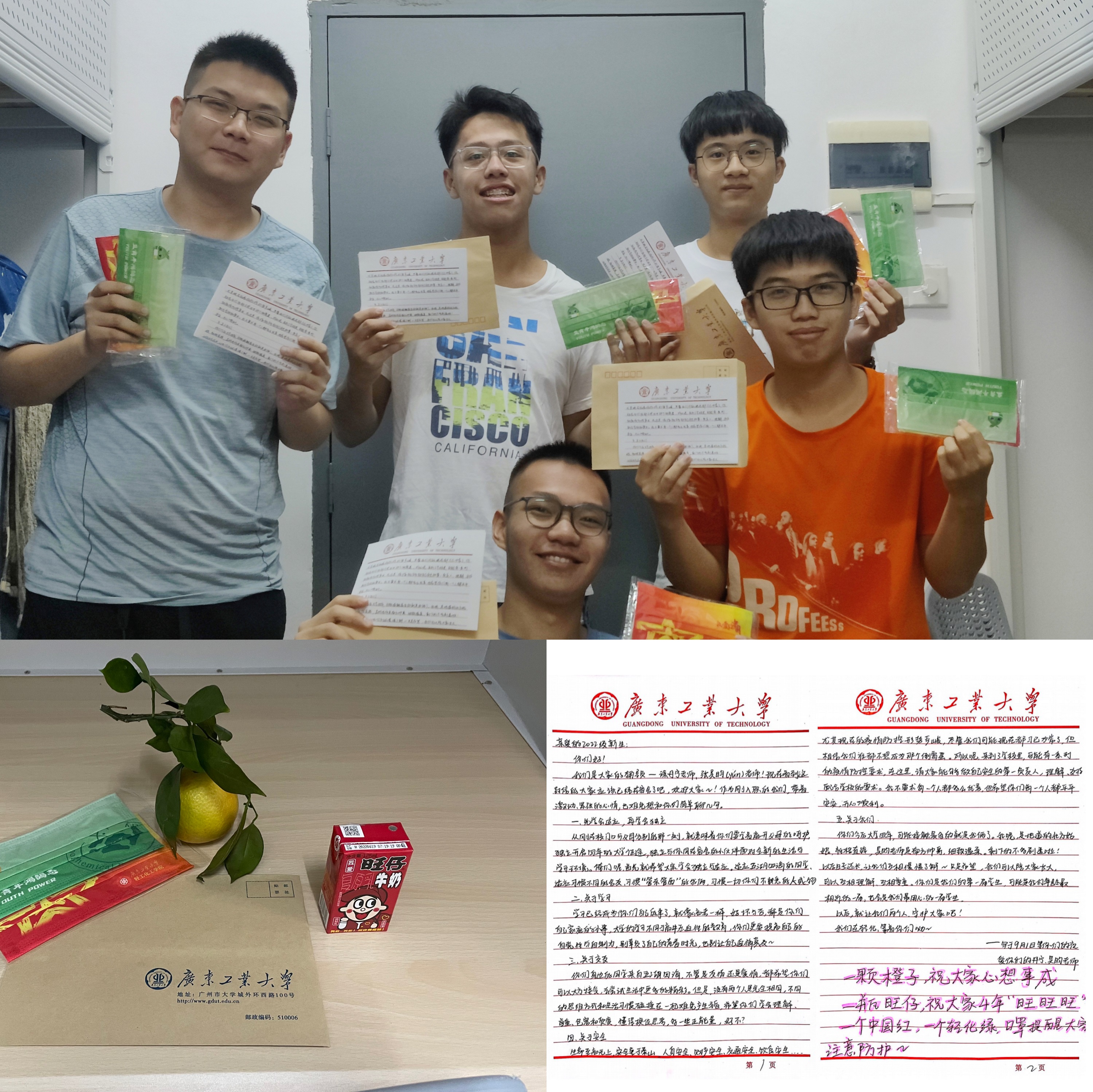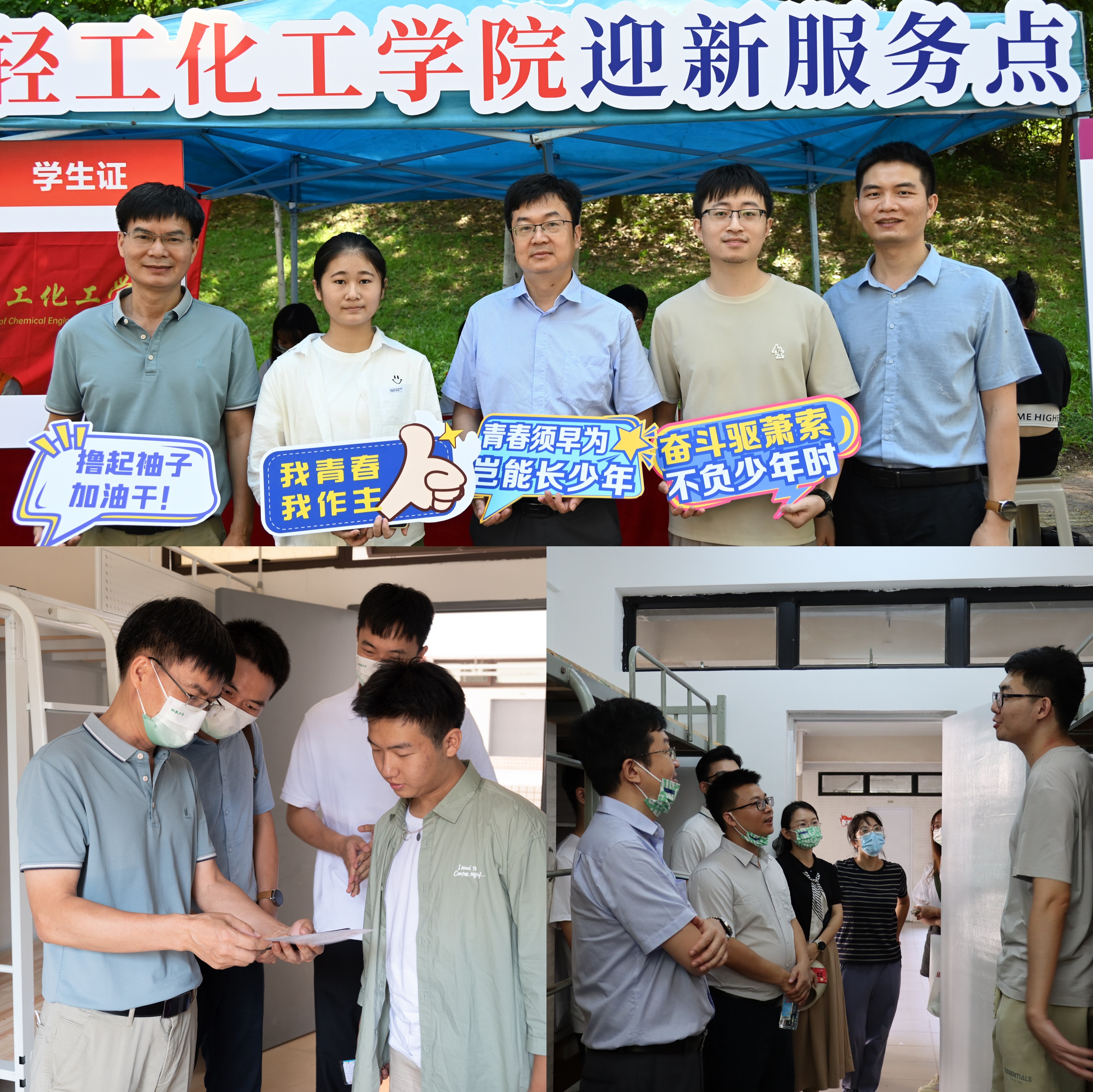 新生。胡书记十分关心新生们初入大学校园的适应情况,亲切询问了同学们在住宿、饮食方面的情况。“感觉到了广工就像回到了自己家一样,宿舍环境特别好,非常适应!”2022级应用化学4班何子洋、杨俊威同学向胡书记表达着自己对学校的第一感觉,“进学校时,还有师兄师姐帮忙拿行李,真是格外亲切!”2022级化学工程与工艺1班杜锦辉同学指着早已由新生学长摆放在宿舍桌上的“暖心小礼包”说:“一到宿舍就看到辅导员的亲笔信、心想事‘橙’和时运‘旺’盛的祝福、还有学院定制的中国红、轻化绿口罩,非常暖心,很有归属感。”离别时,陈卓武副校长还不忘叮嘱同学们入校后要注意疫情防护和人身财产安全,谨防上当受骗。随后,胡钦太书记一行来到学院迎新服务点,指导迎新工作,看望参与迎新工作的师生。