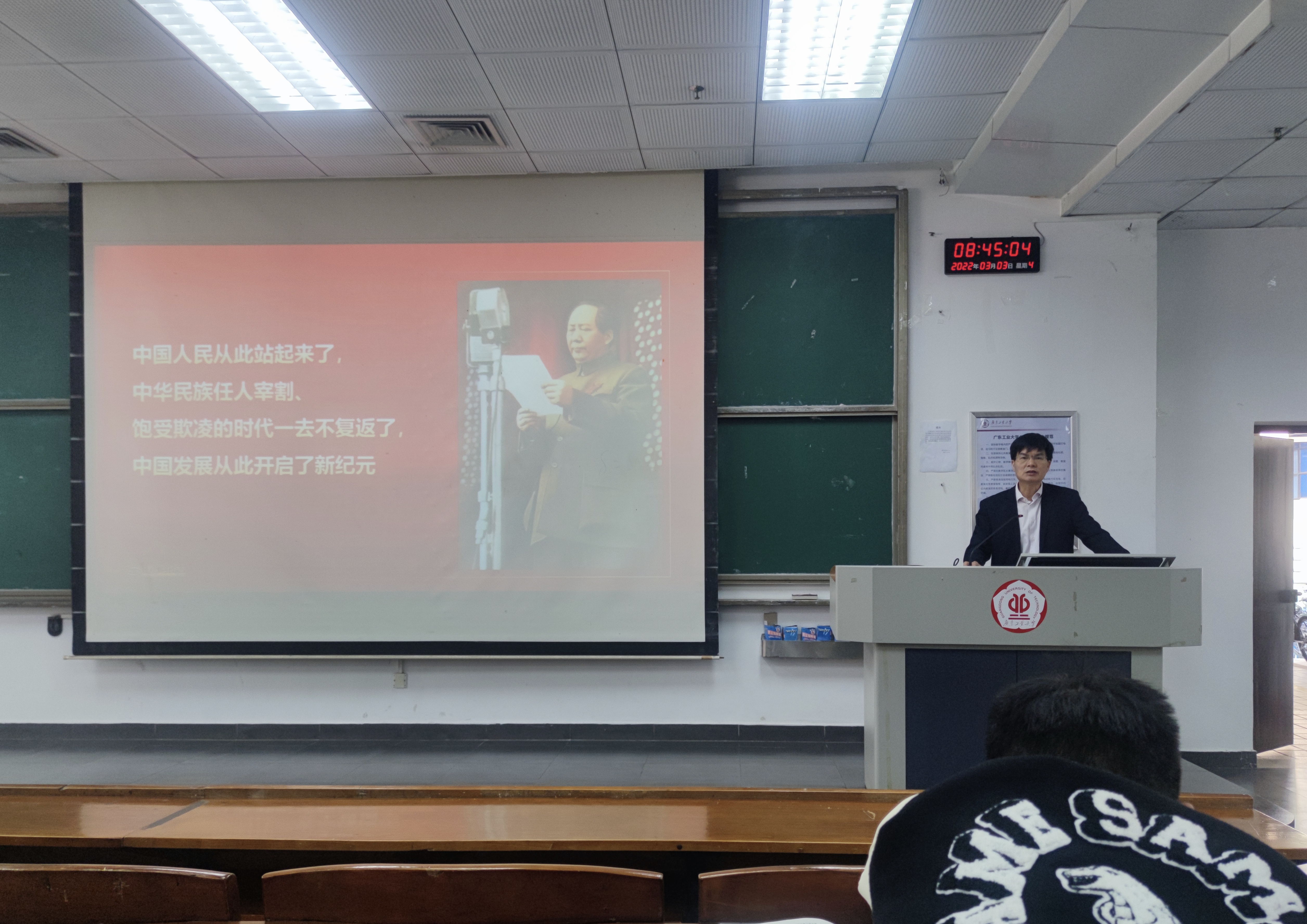 党委书记周东斌老师于3月3日上午为2021级应用化学专业、食品科学与工程专业共计246名学生讲授了一堂思想政治课。