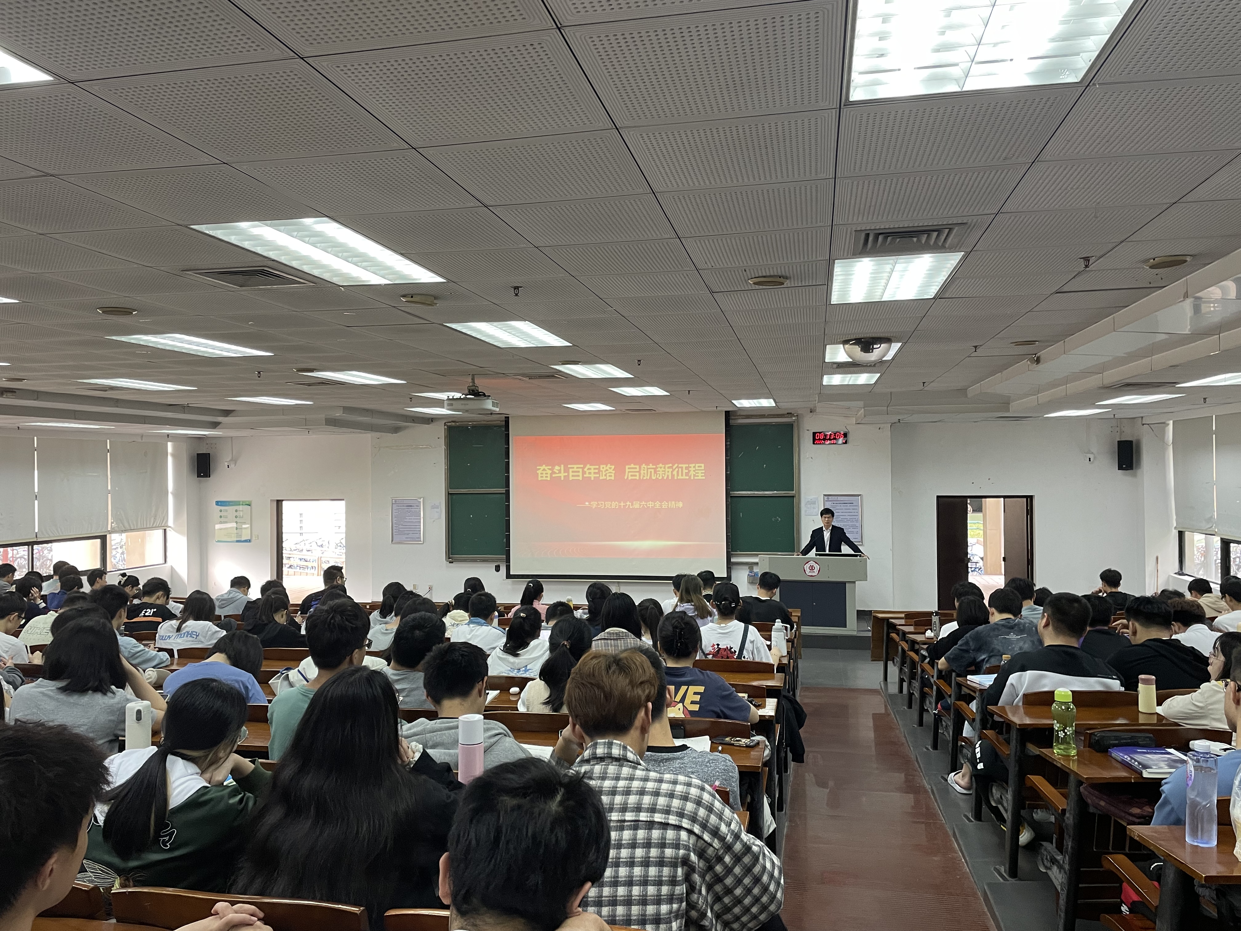 周东斌老师以《奋斗百年路,启航新征程——学习党的十九届六中全会精神》为题,从“镌刻史册的伟大飞跃 不可逆转的复兴进程”、“气象万千的伟大时代 浓墨重彩的崭新篇章”、“永葆初心的大党担当 伟大光荣的历史贡献”、“弥足珍贵的精神财富 开创未来的行动指南”四个方面向同学们讲解了党的十九届六中全会精神的主要内容。最后,他希望同学们充分认识到学习贯彻党的十九届六中全会精神的重大意义,能够在深入学习与不断领悟中认识到红色政权来之不易、美好生活来之不易,进一步坚定理想信念,厚植家国情怀,不断增强做中国人的志气、骨气、底气,不断坚定紧跟党走中国特色社会主义道路的信念决心,为实现第二个百年奋斗目标、实现中华民族伟大复兴的中国梦而励志成才、不懈奋斗,以优异成绩迎接党的二十大胜利召开。