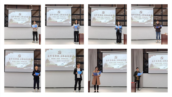 第一部分学习专题结束后,会议第二部分“奋斗百年路,启航新征程”系列主题活动“我和我的入党故事”随之展开。潘国懿同志指出,2021年我党将迎来百年华诞,从建党的开天辟地,到新中国成立的改天换地,到改革开放的翻天覆地,再到党的十八大以来党和国家事业取得历史性成就、发生历史性变革,中国共产党带领中国人民砥砺奋进,从一个胜利走向又一个胜利,百年征程波澜壮阔,百年大党风华正茂,每个党员对党有不同的思念,每个党员入党时有不同的故事,为热烈庆祝党成立100周年的伟大时刻,本支部全体党员以实际行动为党献礼。支部四位正式党员黄权锋、黄远婷、刘香英、陈超以及四位发展对象:王鸿绵、吴振深、张路路、张健文8位同志分别从老党员和新党员的发展心路历程向全体党支部师生演讲并分享了他们的入党故事。