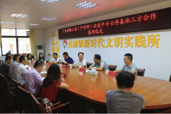 校外实习基地”以及“大学生创新创业实训孵化基地”正式成立,并分别在云浮市协同创新科技有限公司和郁南县建城镇政府顺利举行了两个平台合作签约和挂牌仪式。三方分别就平台未来的建设思路、加强协作推进项目建设进行深入的探讨,随后在领导与嘉宾的见证下,各方代表共同为两个平台揭牌。云浮市科技局产学研科副科长傅小玲、云浮市郁南县建城镇党委副书记、镇长莫球兴等党政领导、云浮市协同创新科技有限公司董事长谢良、云浮市协同创新科技有限公司总经理耿宜顺等出席了本次签约和揭牌仪式。