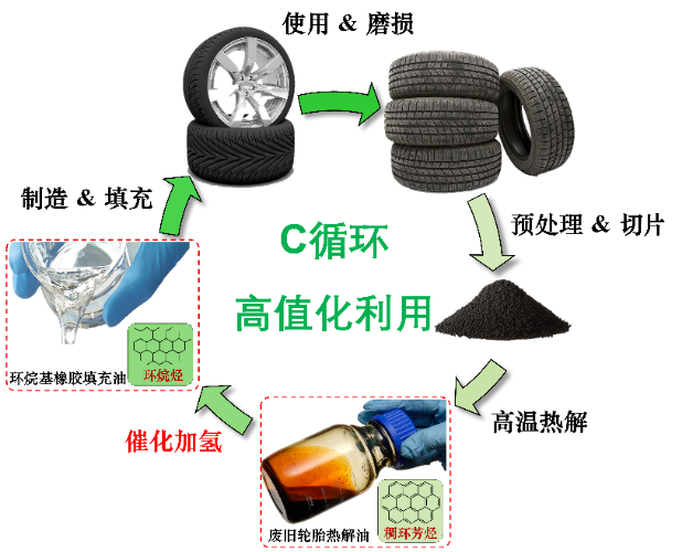 绿色能源催化团队在该项目中主要负责废旧轮胎热解油中高芳烃油馏段的高效定向催化加氢过程。通过自主研发的高选择性非贵金属催化剂,将高芳烃油定向加氢制备得到符合国际标准的环保型橡胶填充油。该过程能够极大提高废旧轮胎利用率,实现废旧轮胎热解油的低成本、高值化利用。