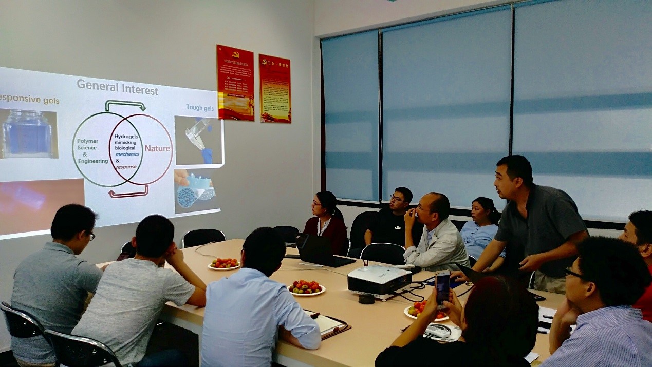 应化系青年百人高粱副教授给大家做了题为“短烷烃链接枝的聚乙烯醇水凝胶材料的动态与静态力学表征——疏水相互作用的理解与实践”的报告,从构筑高度纠缠的网络构型、化学稳定性高且动态的纯物理键、优化链纠缠点数量及其对动态键的桥接作用等角度出发,使用短烷烃碳链接枝高分子量聚乙烯醇,制备了高模量及高强韧的水凝胶材料,并结合静态力学测试及经典物理模型,建立了链段松弛时间、有效活性体积、平均表观活化能和链纠缠点等物理参数与水凝胶材料结构之间的关联机制。相关成果在生物医学、可植入器件和软体机器人等领域有潜在应用前景。