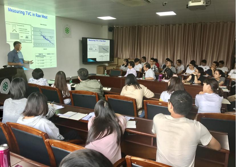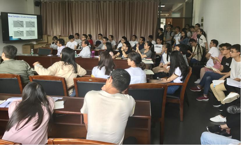Dmitri教授作了题为“Oxygen sensor based systems for food quality and safety assessment ”的学术报告。报告围绕分子氧的检测以及应用做了详细阐述,该检测原理基于磷光照射时的能量转移,无需加入任何化学试剂,可以实现对包装食品中的微生物进行检测,同时开发了GreenLight930产品投入市场快速测定食源性致病菌。最后Dmitri教授总结说明了氧气检测的重要意义,并与在场师生进行了充分的讨论和交流。Dmitri教授报告内容丰富,言辞风趣幽默,深得在场师生的喜爱。