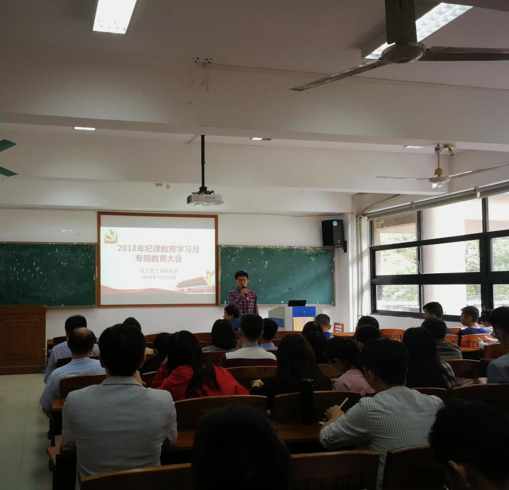 在工学三号馆208报告厅召开了2018年纪律教育学习月专题教育大会。会议由学院党委书记周东斌同志主持,学院党委委员、全体教职工党员、教职工入党积极分子、学生党员参加了大会。
